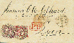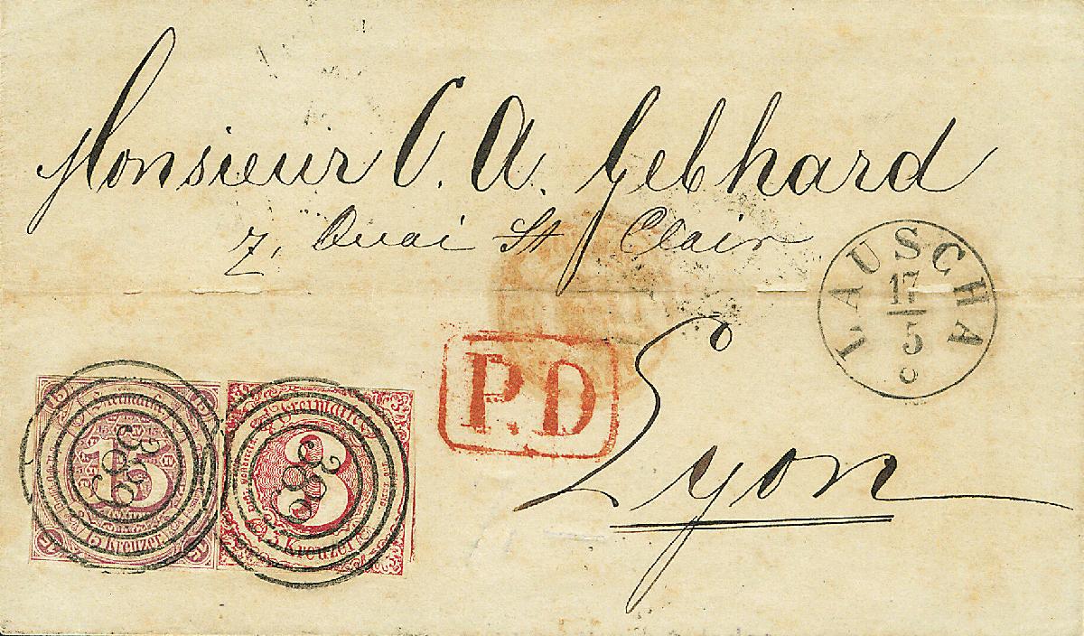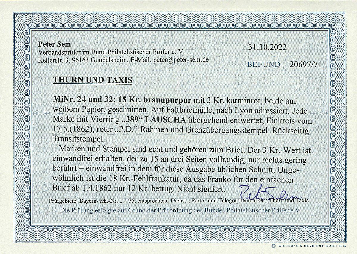 | Zusatzinformationen und Suchstichworte: | Dr. Derichs 170. Auktion 3. Juni 2023 Los 1402 Altdeutschland Thurn und Taxis 15 Kr. braunpurpur, nur rechts gering berührt und an den anderen drei Seiten voll- bis breitrandig zusammen mit vierseitig voll- bis überrandiger 3 Kr. karminrot auf Brief mit zwei klaren Nummernstempeln "389" und Aufgabe-K1 "Lauscha 17/5" (1862) nach Lyon/Frankreich, nebengesetzt roter "P.D.". Wohl aus Unwissenheit hat der Absender den Brief mit dieser 18-Kreuzer-Frankatur überfrankiert, denn 12 Kreuzer wären ausreichend gewesen. Ein interessanter und attraktiver Auslandsbrief. Neuer Fotobefund Sem BPP Zuschlag 170,00 EUR |