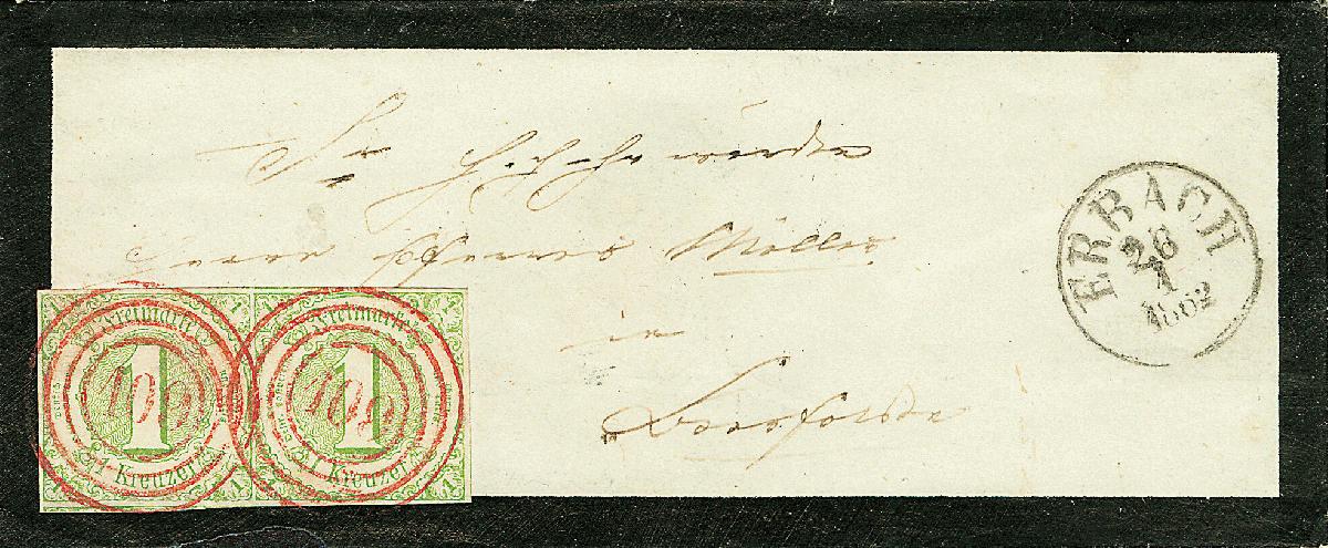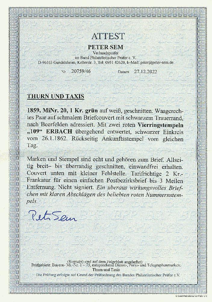 | Zusatzinformationen und Suchstichworte: | Dr. Derichs 170. Auktion 3. Juni 2023 Los 1403 Altdeutschland Thurn und Taxis 1 Kr. grün, waagerechtes Paar, ringsum breit- bis überrandig geschnitten mit Teilen bzw. Ansätzen von vier Nachbarmarken auf kleinem Trauerkuvert (rückseitig unten kleine Fehlstelle, ohne Bedeutung) mit zwei leuchtend roten Nummernstempeln "109" (Handbuch = 500.-) und Aufgabe-K1 "Erbach 26.1.1862" nach Beerfelden. Luxus. Fotoattest Dr. Helbig BPP und neues Fotoattest Sem BPP: "einwandfrei erhalten... Ein überaus wirkungsvolles Briefchen mit klaren Abschlägen des beliebten roten Nummernstempels." Zuschlag 1.800,00 EUR |