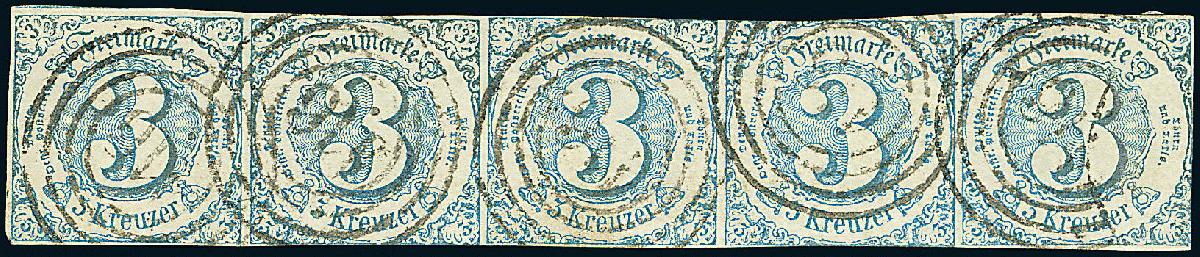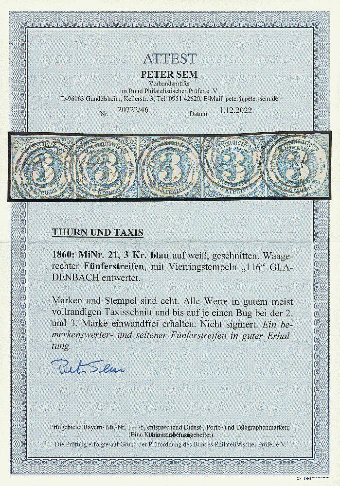 | Zusatzinformationen und Suchstichworte: | Dr. Derichs 170. Auktion 3. Juni 2023 Los 1407 Altdeutschland Thurn und Taxis 3 Kreuzer blau, waagerechter Fünferstreifen mit Nummernstempeln "116" GLADENBACH, alle Werte in gutem meist vollrandigen Taxisschnitt mit Teil der linken oberen Nachbarmarke und bis auf je einen Bug bei der zweiten und dritten Marke einwandfrei. Neues Fotoattest Sem BPP: "Ein bemerkenswerter und seltener Fünferstreifen in guter Erhaltung." Zuschlag 360,00 EUR |