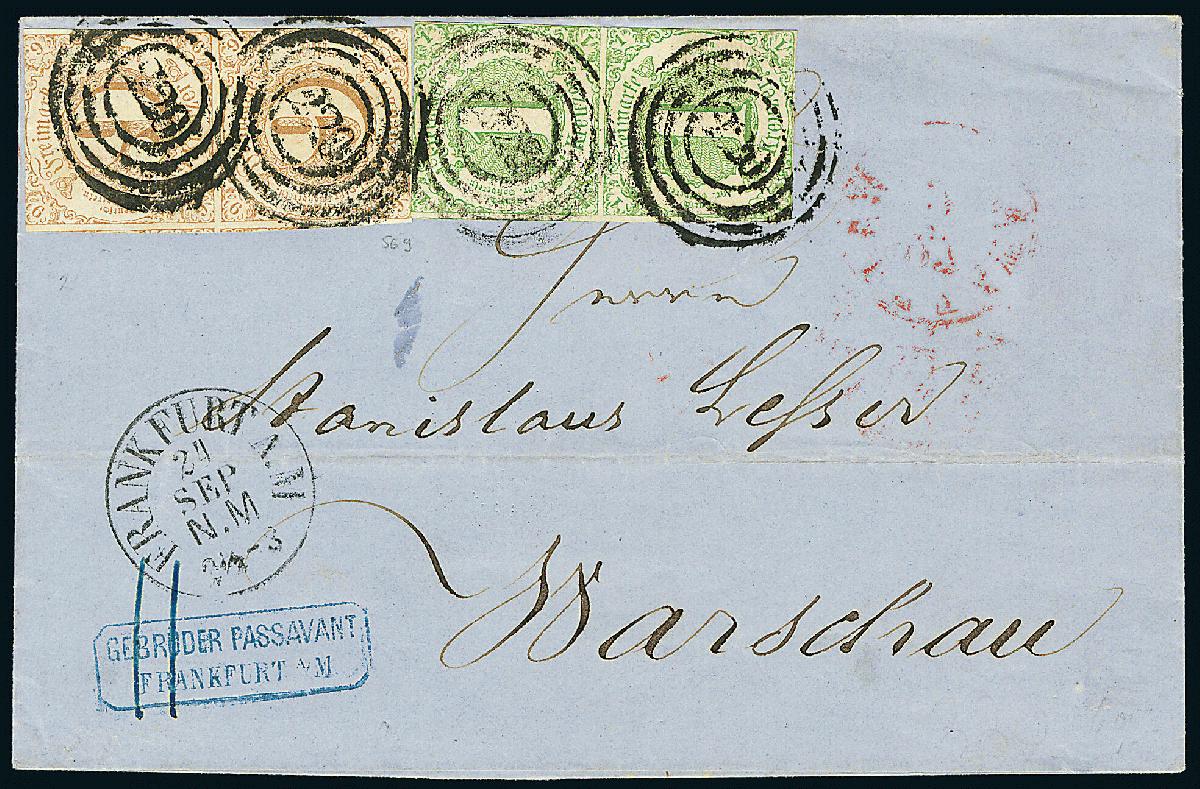 | Zusatzinformationen und Suchstichworte: | Dr. Derichs 170. Auktion 3. Juni 2023 Los 1408 Altdeutschland Thurn und Taxis \DESTINATION "POLEN"\: 1 Kr. grün im senkrechten Paar zusammen mit senkrechtem "Typen-Paar" 9 Kr. ockerbraun (obere Marke Type "II", untere Type "I") auf Brief mit Nummernstempeln "220" und Aufgabe-K1 "Frankfurt a.M. 24 Sep." nach Warschau/Polen. Die untere 9 Kreuzer ist einwandfrei, die anderen Marken sind jeweils nur einseitig gering berüht. Tarifrichtige 20-Kreuzer-Frankatur via Preußen mit 9 Kreuzer für den Postverein und 11 Kreuzer Weiterfranko. Neues Fotoattest Sem BPP: "Taxis-Briefe nach Warschau sind nicht häufig. Zuschlag 750,00 EUR |
