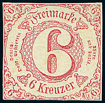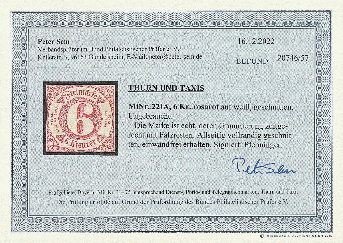 | Zusatzinformationen und Suchstichworte: | Dr. Derichs 170. Auktion 3. Juni 2023 Los 1409 Altdeutschland Thurn und Taxis 6 Kr. rosarot, Type "IA", ungebrauchtes Kabinettstück mit originaler Gummierung. Neuer Fotobefund Sem BPP: "einwandfrei erhalten". (Mi. 450.-) Zuschlag 260,00 EUR |