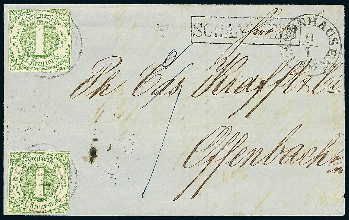 | Zusatzinformationen und Suchstichworte: | Dr. Derichs 170. Auktion 3. Juni 2023 Los 1395 Altdeutschland Thurn und Taxis 1 Kr. grün, zwei Exemplare, die obere einwandfrei, die untere links leicht berührt und sonst einwandfrei, auf Brief mit Nummernstempel "91" als Entwerter und Aufgabe-K1 "Babenhausen 9/1 1863" nach Offenbach, nebengesetzt seltener Landpost-Ra1 "Schaafheim". Eine seltene Stempel-Kombination. Neuer Fotobefund Sem BPP. (Sem-Handbuch nur für den Landpoststempel = 400.-). Zuschlag 180,00 EUR |