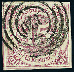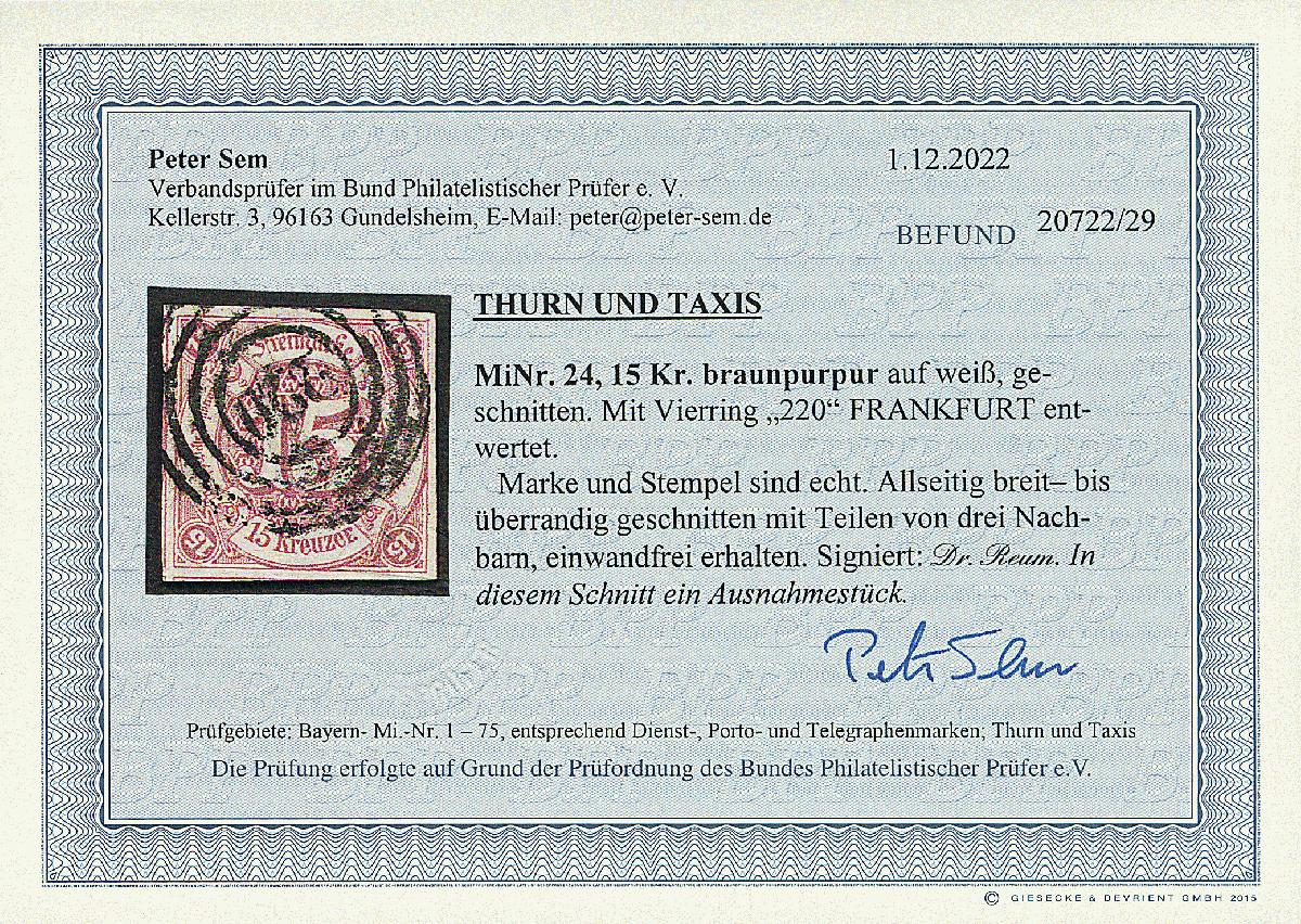 | Zusatzinformationen und Suchstichworte: | Dr. Derichs 170. Auktion 3. Juni 2023 Los 1413 Altdeutschland Thurn und Taxis 15 Kr. braunpurpur, allseits breit- bis überrandig geschnitten mit Teilen von drei Nachbarmarken, gestempelt mit Nummernstempel "220" FRANKFURT/MAIN. Luxus. Neuer Fotobefund Sem BPP: "einwandfrei erhalten... In diesem Schnitt ein Ausnahmestück." Zuschlag 130,00 EUR |