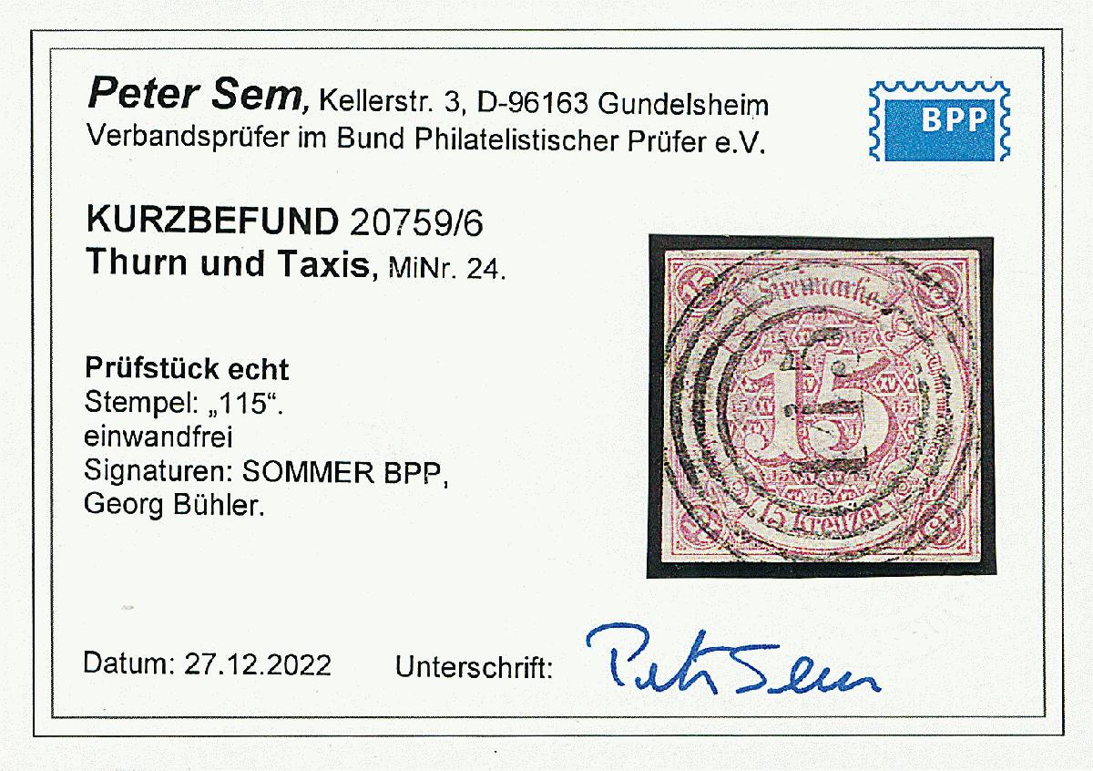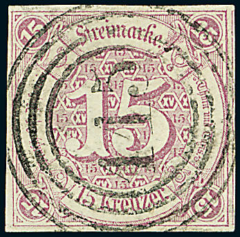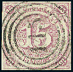 | Zusatzinformationen und Suchstichworte: | Dr. Derichs 170. Auktion 3. Juni 2023 Los 1414 Altdeutschland Thurn und Taxis 15 Kr. braunpurpur, vierseitig breitrandig bzw. rechts sogar auf voller Länge mit Teil der Nachbarmarke, klar gestempelt "115" GIESSEN. Luxus. Neuer Fotobefund Sem BPP: "einwandfrei". Zuschlag 160,00 EUR |