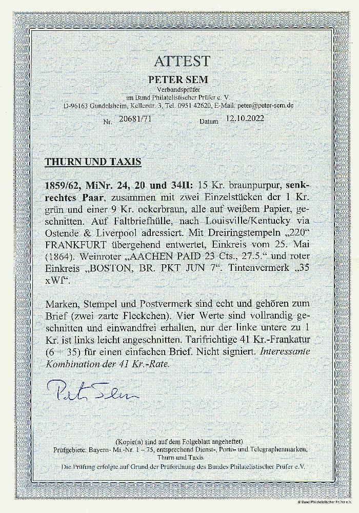 | Zusatzinformationen und Suchstichworte: | Dr. Derichs 170. Auktion 3. Juni 2023 Los 1419 Altdeutschland Thurn und Taxis 15 Kr. braunpurpur im senkrechten Paar zusammen mit zweimal 1 Kr. grün und 9 Kr. ockerbraun auf Brief mit Nummernstempeln "220" und K1 "Frankfurt a.M. 25 Mai" (1864) nach Louisville/Kentucky/USA, vorderseitig rote Durchgangsstempel von Aachen und Boston. Vier Marken sind vollrandig und einwandfrei, nur die linke untere 1 Kreuzer ist links berührt. Tarifrichtige 41-Kreuzer-Frankatur mit 6 Kreuzer für den Postverein und 35 Kreuzer Weiterfranko - seltene Darstellung dieser Portorate durch eine Dreifarbenfrankatur über zwei Ausgaben mit fünf Marken. Fotoattest Dr. Sommer BPP und neues Fotoattest Sem BPP. Zuschlag 400,00 EUR |