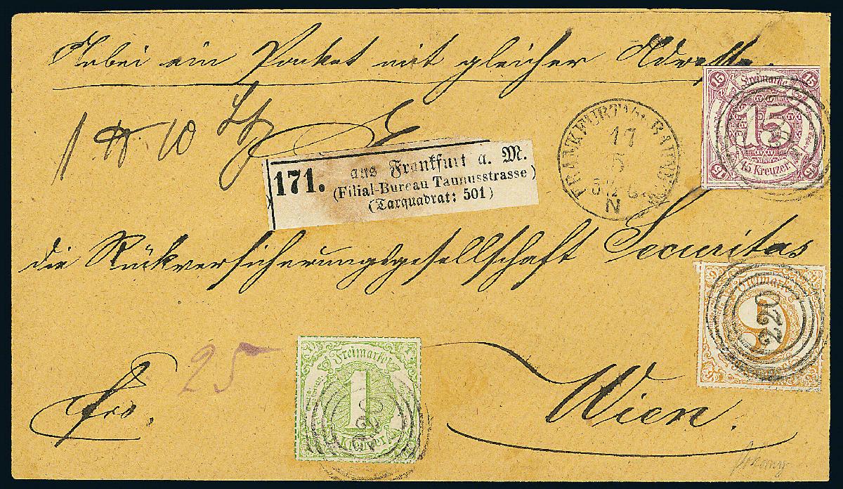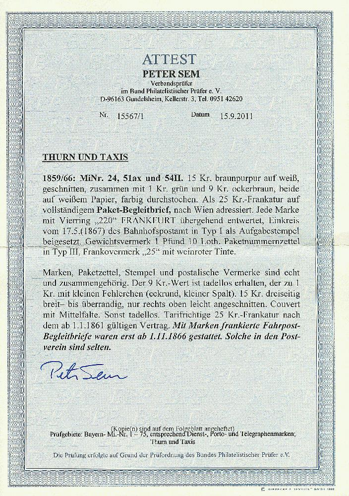 | Zusatzinformationen und Suchstichworte: | Dr. Derichs 170. Auktion 3. Juni 2023 Los 1426 Altdeutschland Thurn und Taxis 15 Kr. braunpurpur, nur rechts oben leicht tangiert und sonst breit- bis überrandig, in Mischfrankatur mit 1 Kr. grün (eckrund, kleiner Spalt) und 9 Kr. ockerbraun, beide "farbig durchstochen", auf Paketbegleitbrief mit Nummernstempeln "220" und Aufgabe-K1 "Frankfurt a./M. Bahnhof 17/5" (1867) nach Wien/Österreich, mit schwarz/weißem Paketzettel "171. aus Frankfurt a.M. (Filial-Bureau Taunusstrasse) (Taxquadrat: 501)". Tarifrichtige Dreifarben-Mischfrankatur über 25 Kreuzer nach dem ab 1.1.1861 gültigen Vertrag. Neues Fotoattest Sem BPP: "Mit Marken frankierte Fahrpost-Begleitbriefe waren erst ab 1.11.1866 gestattet. Solche in den Postverein sind selten." Zuschlag 650,00 EUR |