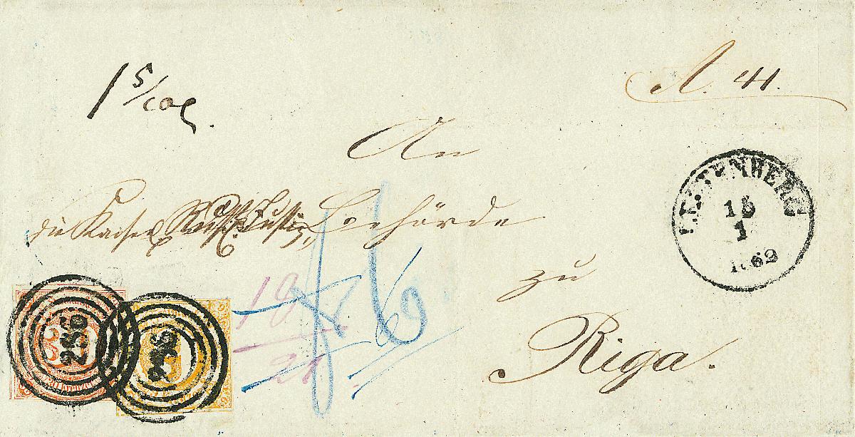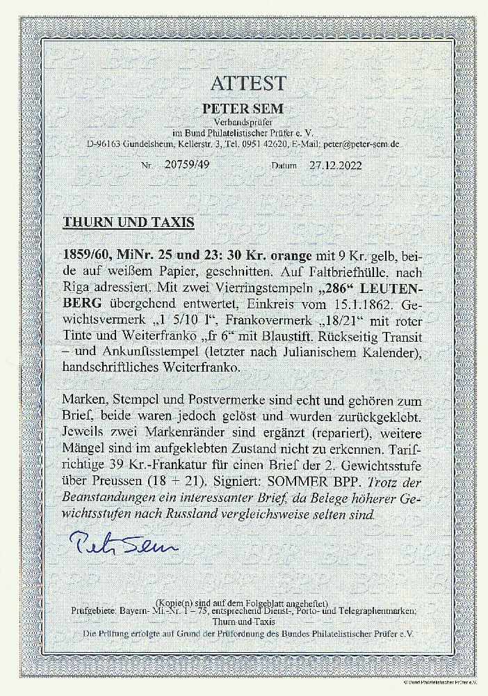 | Zusatzinformationen und Suchstichworte: | Dr. Derichs 170. Auktion 3. Juni 2023 Los 1428 Altdeutschland Thurn und Taxis 30 Kr. orange und 9 Kr. gelb auf Brief mit zwei Nummernstempeln "286" und Aufgabe-K1 "Leutenberg 15.1.1862" nach Riga/Rußland. Beide Marken waren gelöst und sind exakt replaziert, jeweils zwei Markenränder wurden ergänzt. Tarifrichtige 39-Kreuzer-Frankatur für einen Brief der zweiten Gewichtsstufe über Preußen nach Rußland mit 18 Kreuzer für den Postverein und 21 Kreuzer Weiterfranko. Ein extrem seltener Brief mit der 30-Kreuzer-Marke, die die höchste Nominale des Sammelgebietes darstellt. Neues Fotoattest Sem BPP: "ein interessanter Brief, da Belege höherer Gewichtsstufen nach Rußland vergleichsweise selten sind." Zuschlag 1.700,00 EUR |