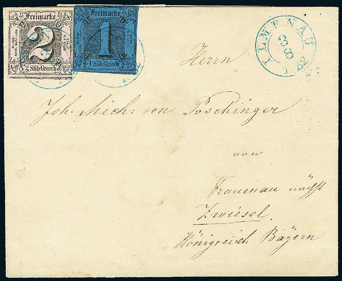 | Zusatzinformationen und Suchstichworte: | Dr. Derichs 170. Auktion 3. Juni 2023 Los 1307 Altdeutschland Thurn und Taxis 1 Sgr. schw./blau, teils überrandiger Taxisschnitt, zusammen mit allseitig voll- bis überrandiger 2 Sgr. schw./rosa auf Postvereinsbrief mit guten blauen K2 "Ilmenau 3/8 1862" als Entwerter und nochmals beigesetzt (zusätzlicher Federzug abgeschwächt) nach Frauenau bei Zwiesel/Königreich Bayern. Zuschlag 110,00 EUR |