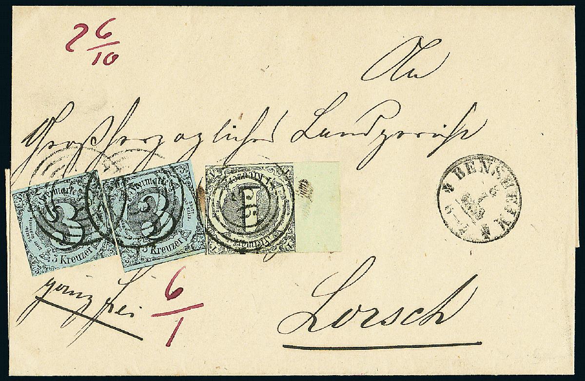 | Zusatzinformationen und Suchstichworte: | Dr. Derichs 170. Auktion 3. Juni 2023 Los 1335 Altdeutschland Thurn und Taxis 1 Kr. schw./graugrün, linkes Luxus-Randstück mit 11,5mm breitem Bogenrand, an den anderen drei Seiten voll- bis überrandig mit Ansätzen von zwei Nachbarmarken, zusammen mit zweimal 3 Kr. schw./hellgrautürkis im Taxisschnitt auf frischem Brief mit Nummernstempeln "95" und Aufgabe-K1 "Bensheim 8/7" nach Lorsch. Tarifrichtige 7-Kreuzer-Frankatur für einen Brief der dritten Gewichtsstufe bis 3 Meilen Entfernung im Postbezirk mit im voraus bezahlten Bestellgeld Zuschlag 150,00 EUR |