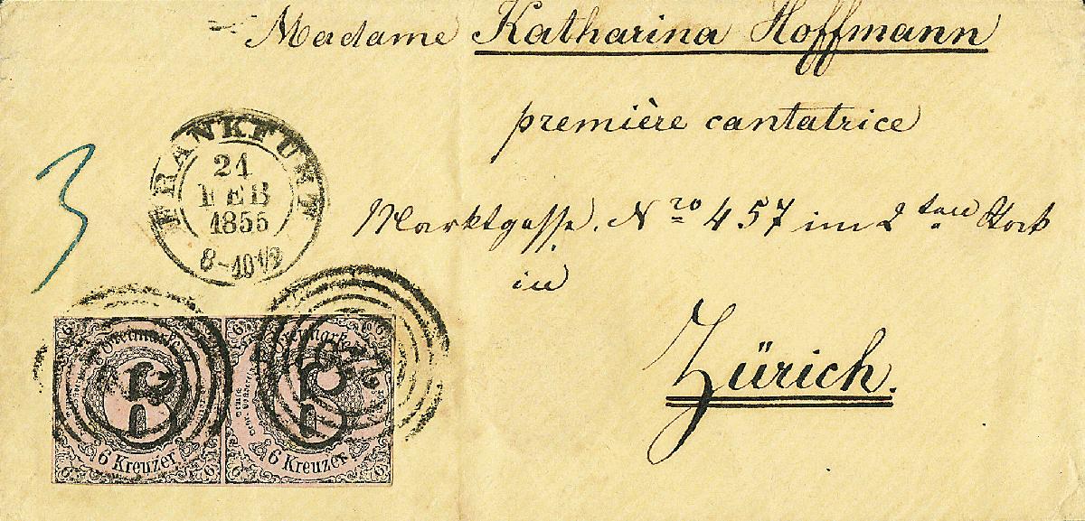 | Zusatzinformationen und Suchstichworte: | Dr. Derichs 170. Auktion 3. Juni 2023 Los 1338 Altdeutschland Thurn und Taxis 6 Kr. schw./rosa, Type "IA", tiefe frische Farbe, waagerechtes Paar, ringsum vollrandig auf Brief mit Nummernstempeln "220" und Aufgabe-K2 "Frankfurt 21 Feb.1855" nach Zürich/Schweiz. Kabinett. Tarifrichtige 12-Kreuzer-Frankatur für einen einfachen Brief in den 1. Rayon der Schweiz mit 9 Kreuzer für den Postverein und 3 Kreuzer Weiterfranko Zuschlag 260,00 EUR |