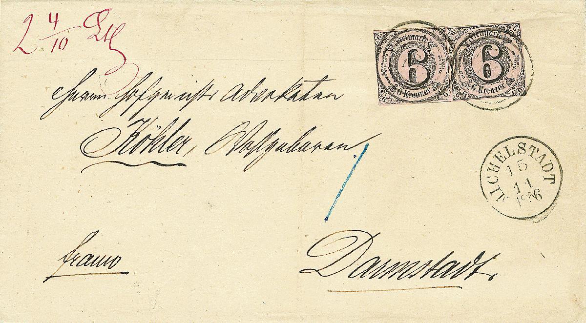 | Zusatzinformationen und Suchstichworte: | Dr. Derichs 170. Auktion 3. Juni 2023 Los 1340 Altdeutschland Thurn und Taxis 6 Kr. schw./mattrötlichkarmin, zwei Exemplare (einmal Type "IA" und einmal Type "IB") als Paar geklebt auf Brief der dritten Gewichtsstufe mit Nummernstempeln "135" und Aufgabe-K1 "Michelstadt 15.11.1856" nach Darmstadt. Kabinett. Ungewöhnliche Mehrfachfrankatur der 6-Kreuzer-Marke auf Inlandsbrief Zuschlag 1.600,00 EUR |