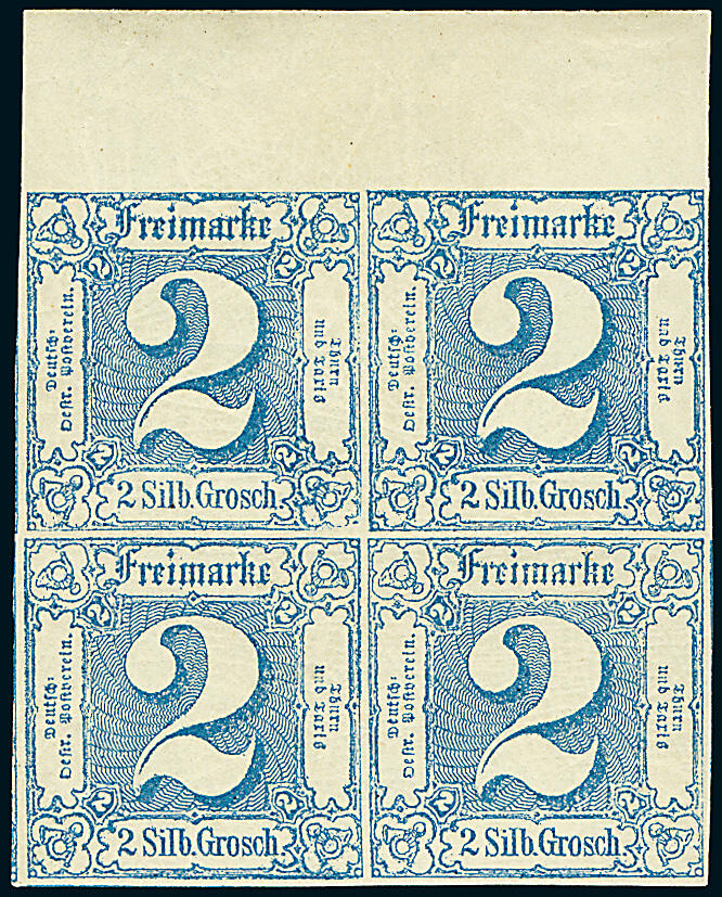 | Zusatzinformationen und Suchstichworte: | Dr. Derichs 170. Auktion 3. Juni 2023 Los 1433 Altdeutschland Thurn und Taxis 2 Sgr. blau, ungebrauchter Viererblock vom Oberrand, dieser 12mm breit, auch an den anderen drei Seiten überall voll- bis überrandig mit Ansätzen von vier Nachbarmarken. Luxus. Neuer Fotobefund Sem BPP: "einwandfrei". Zuschlag 100,00 EUR |