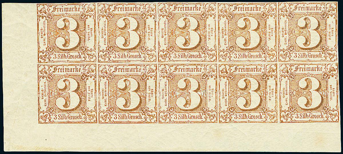 | Zusatzinformationen und Suchstichworte: | Dr. Derichs 170. Auktion 3. Juni 2023 Los 1434 Altdeutschland Thurn und Taxis \LINKE UNTERE BOGENECKE\: 3 Sgr. ockerbraun, waagerechter Zehnerblock aus der linken unteren Bogenecke mit 12 bzw. 11mm breiten Bogenrändern, an den anderen beiden Seiten gleichmäßig vollandig, postfrisch, dabei lediglich die oberen beiden Eckmarken mit Falzspuren. Unsigniert, neuer Fotobefund Sem BPP: "einwandfrei erhalten". Zuschlag 380,00 EUR |