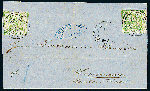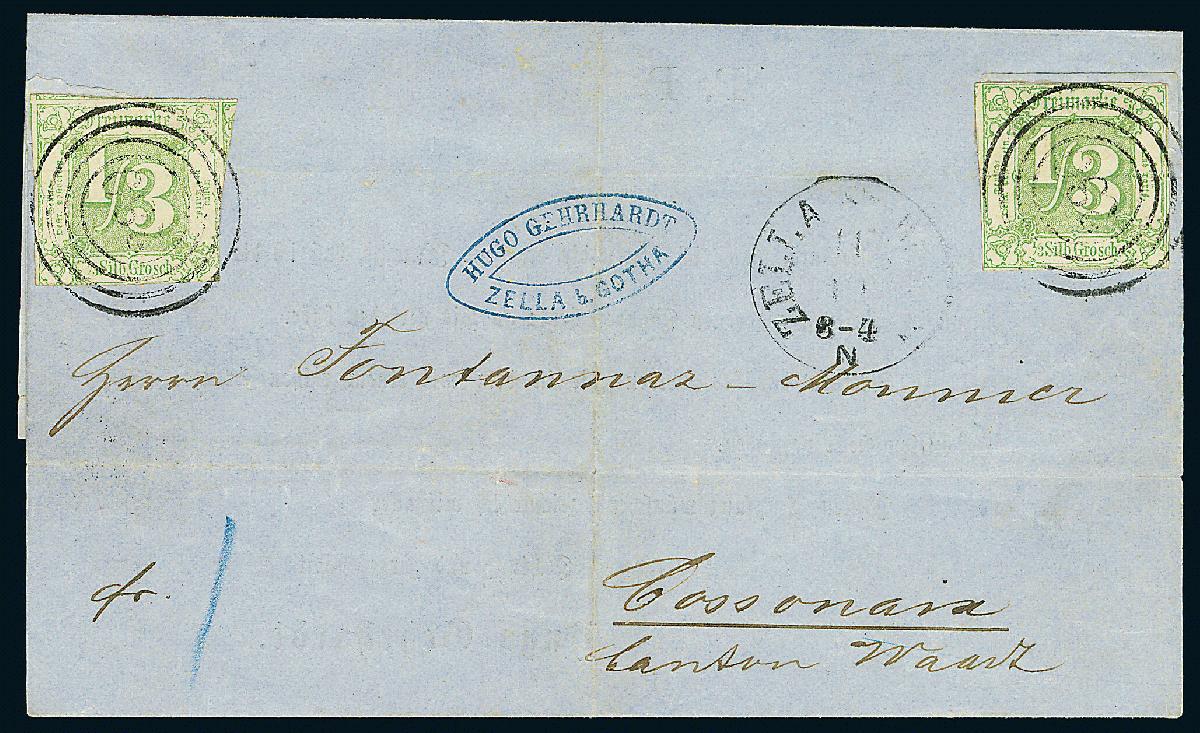 | Zusatzinformationen und Suchstichworte: | Dr. Derichs 170. Auktion 3. Juni 2023 Los 1435 Altdeutschland Thurn und Taxis \AUSLANDS-DRUCKSACHE\: 1/3 Sgr. grün, zwei Exemplare in teils vollrandigem Taxisschnitt, waagerechter Bug (dadurch bei rechter Marke kleiner Riß), auf Drucksache (Versandbenachrichtigung für Waren) mit zweimal aufgesetztem Nummernstempel "280" und mit Aufgabe-K1 "Zella St.Blasii 11/10" (1864) nach Cossonaia/Kanton Waadt/Schweiz. Neuer Fotobefund Sem BPP: "Auslands-Drucksachen sind nicht häufig.". Zuschlag 320,00 EUR |