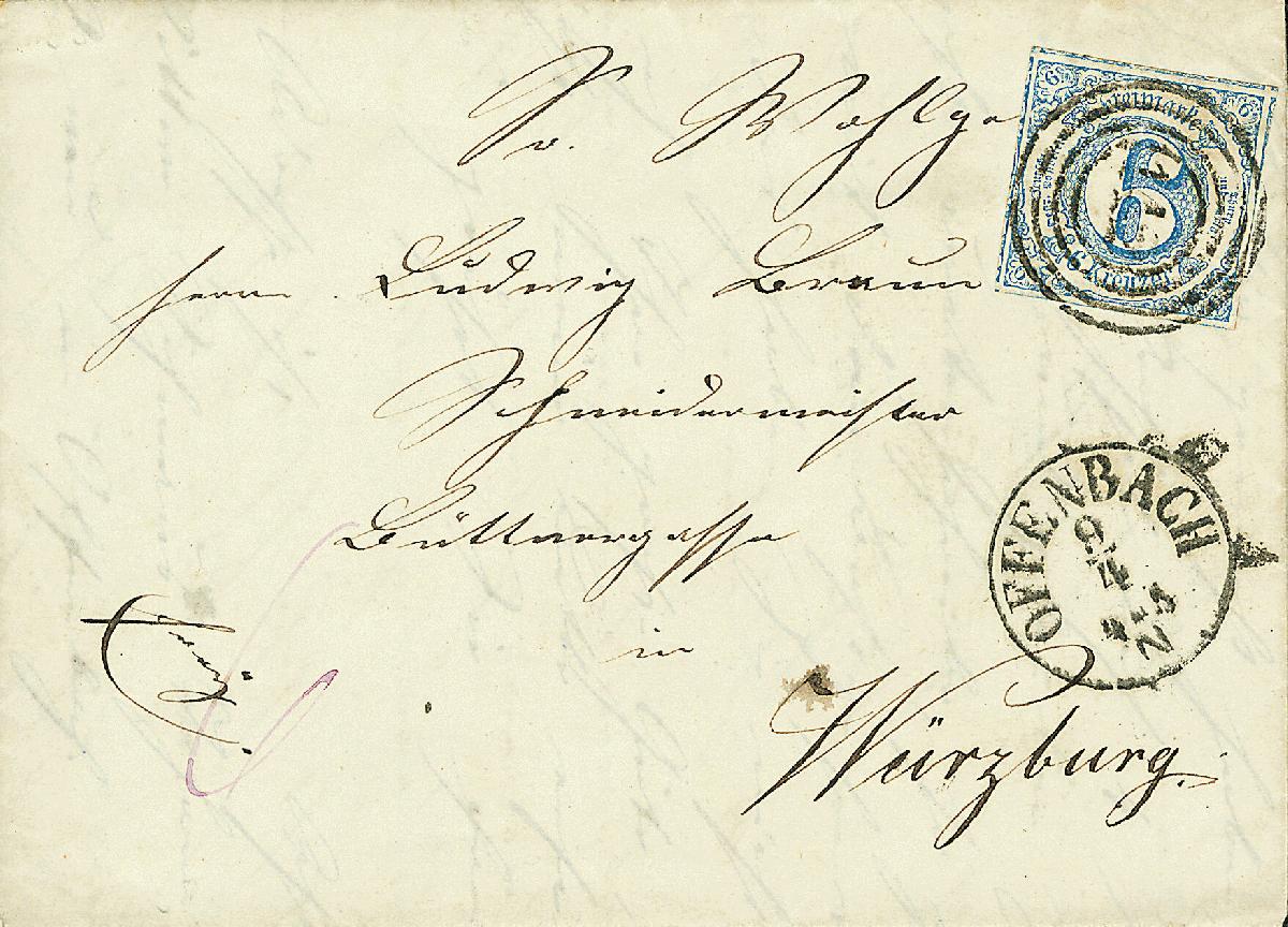 | Zusatzinformationen und Suchstichworte: | Dr. Derichs 170. Auktion 3. Juni 2023 Los 1439 Altdeutschland Thurn und Taxis \"GEM QUALITY"\: 6 Kr. blau, überrandig geschnitten mit Teilen von sieben der acht möglichen Nachbarmarken auf Postvereinsbrief mit Nummernstempel "142" und Aufgabe-K1 "Offenbach 9/4" (1865) nach Würzburg/Königreich Bayern. Luxus. Zuschlag 160,00 EUR |