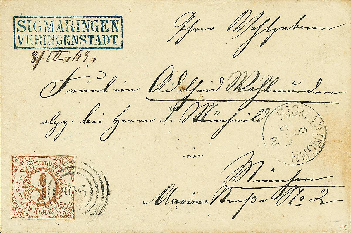 | Zusatzinformationen und Suchstichworte: | Dr. Derichs 170. Auktion 3. Juni 2023 Los 1440 Altdeutschland Thurn und Taxis 9 Kr. ockerbraun, Type "II", vierseitig voll- bis breitrandig auf Kuvert mit Nummernstempel "306" und Neben-K1 "Sigmaringen 8/7" (1863) nach München/Königreich Bayern über Württemberg gelaufen (rückseitig Durchgangsstempel von Aulendorf und Ulm). Luxus. Links oben mit idealem blauen Postablage-Ra2 "Sigmaringen Veringenstadt". Zuschlag 440,00 EUR |