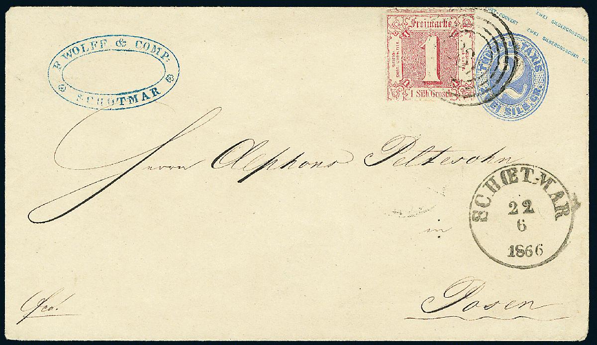 | Zusatzinformationen und Suchstichworte: | Dr. Derichs 170. Auktion 3. Juni 2023 Los 1442 Altdeutschland Thurn und Taxis 1 Sgr. karminrot "farblos durchstochen" als Zusatzfrankatur auf Ganzsachenumschlag 2 Sgr. blau, Kleinformat, mit Nummernstempel "331" und Aufgabe-K1 "Schoetmar 22.6.1866" nach Posen/Königreich Preußen, rückseitig mit Preußen-K2 "Herford 23.6.66" als Grenzübergangsstempel. Luxus. Hübsche Marken/Ganzsachen-Kombination. Neuer Fotobefund Sem BPP: "einwandfrei" Zuschlag 140,00 EUR |