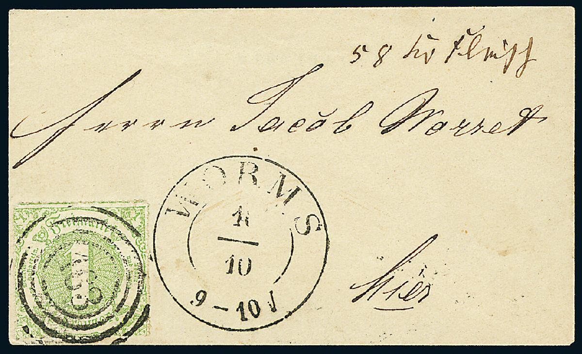 | Zusatzinformationen und Suchstichworte: | Dr. Derichs 170. Auktion 3. Juni 2023 Los 1443 Altdeutschland Thurn und Taxis 1 Kr. grün "farblos durchstochen", Einzelfrankatur auf kleinem Orts-Billetcouvert mit Nummernstempel "163" und beigesetztem großen K2 "Worms". Luxus. Neuer Fotobefund Sem BPP: "einwandfrei". Ausruf 100,00 EUR |
