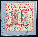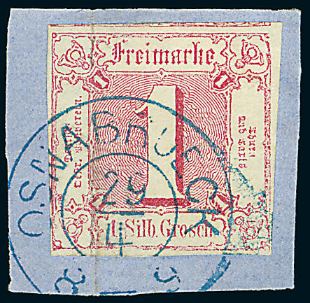 | Zusatzinformationen und Suchstichworte: | Dr. Derichs 170. Auktion 3. Juni 2023 Los 1447 Altdeutschland Thurn und Taxis 1 Sgr. karminrot, vierseitig voll- bis überrandig, oben auf voller Länge mit Teil der Nachbarmarke, auf Briefstück (senkrechter Bug) mit seltener Fremdabstempelung durch klaren blauen Hannover-K2 "Osnabrueck 29/4". Signiert Berger und neuer Fotobefund Sem BPP. Zuschlag 300,00 EUR |