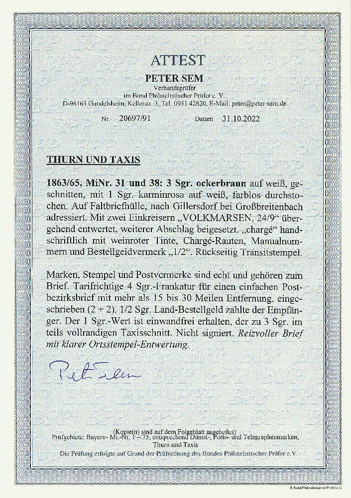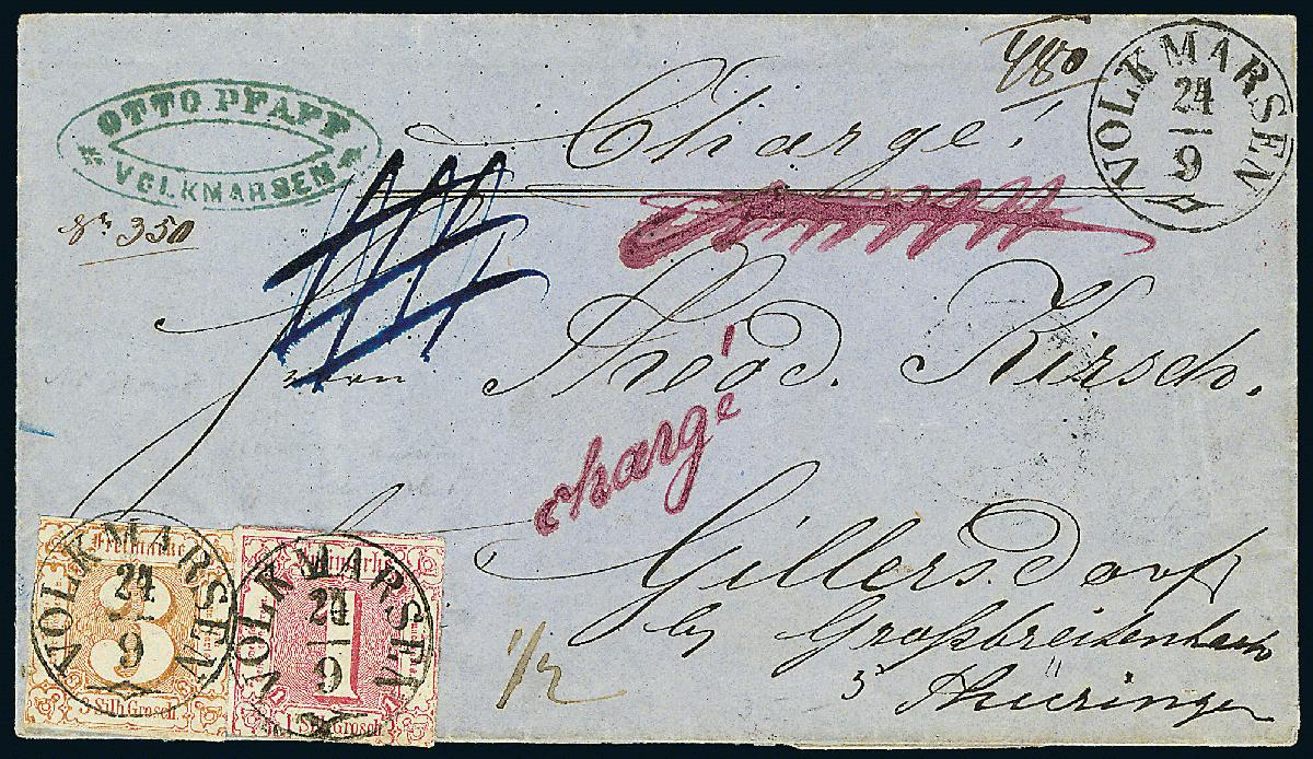 | Zusatzinformationen und Suchstichworte: | Dr. Derichs 170. Auktion 3. Juni 2023 Los 1448 Altdeutschland Thurn und Taxis 3 Sgr. ockerbraun, teils vollrandiger Taxisschnitt, in Mischfrankatur mit tadelloser 1 Sgr. karminrosa "farblos durchstochen" auf Einschreibbrief mit bildschön aufgesetzten K1 "Volkmarsen 24/9" nach Gillersdorf bei Großbreitenbach, "charge" handschriftlich mit roter Tinte beigesetzt und blaues Charge-Gitter. Tarifrichtige 4-Silbergroschen-Frankatur für einen einfachen Postbezirksbrief mit mehr als 15 bis 30 Meilen Entfernung = jeweils 2 Silbergroschen Briefporto und Einschreibgebühr. Das Landbestellgeld von 1/2 Silbergroschen zahlte der Empfänger. Neues Fotoattest Sem BPP: "Reizoller Brief mit klarer Ortsstempel-Entwertung." Zuschlag 750,00 EUR |