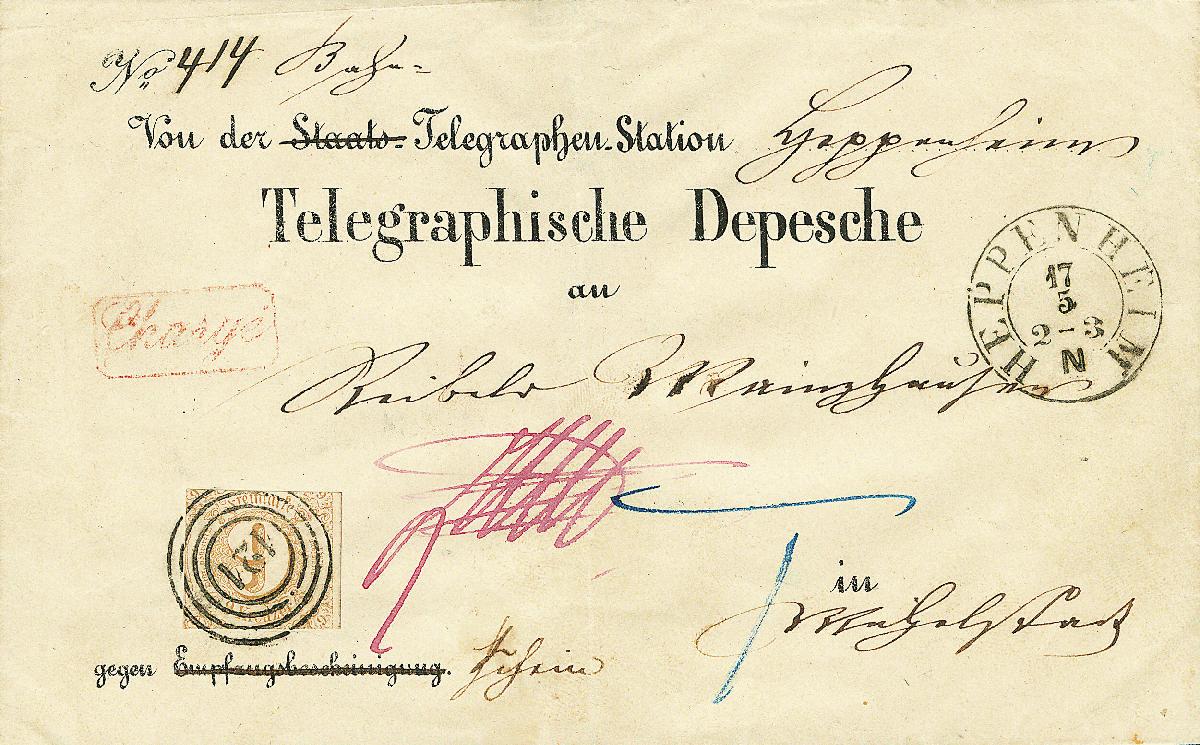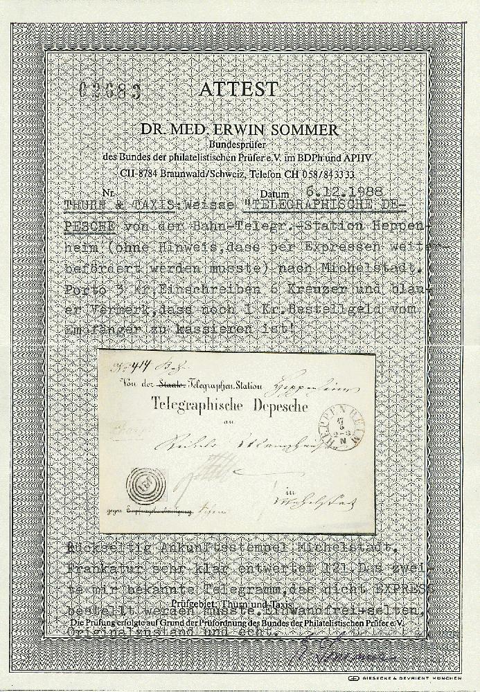 | Zusatzinformationen und Suchstichworte: | Dr. Derichs 170. Auktion 3. Juni 2023 Los 1457 Altdeutschland Thurn und Taxis \FRANKIERTES TELEGRAMM\: 9 Kr. ockerbraun, Type "II" (vom rechten Bogenrand stammend, an den anderen Seiten berührt), auf Vordruckumschlag "Von der Staats-Telegraphen-Station 'Heppenheim' Telegraphische Depesche" mit Nummernstempel "121 und nebengesetztem K2 "Heppenheim 17/5" nach Michelstadt. Die Bezeichnung "Staats-Telegraphen-Station" wurde postalisch in "Bahn-Telegraphen-Station" abgeändert. Nebengesetzt roter Schreibschrift-Ra1 "Charge". Fotoattest Dr. Sommer BPP und neues Fotoattest Sem BPP: "Frankierte Taxis-Telegrammumschläge sind bemerkenswert und selten. Das vorliegende Exemplar ist frisch und wirkungsvoll erhalten." Zuschlag 7.500,00 EUR |
