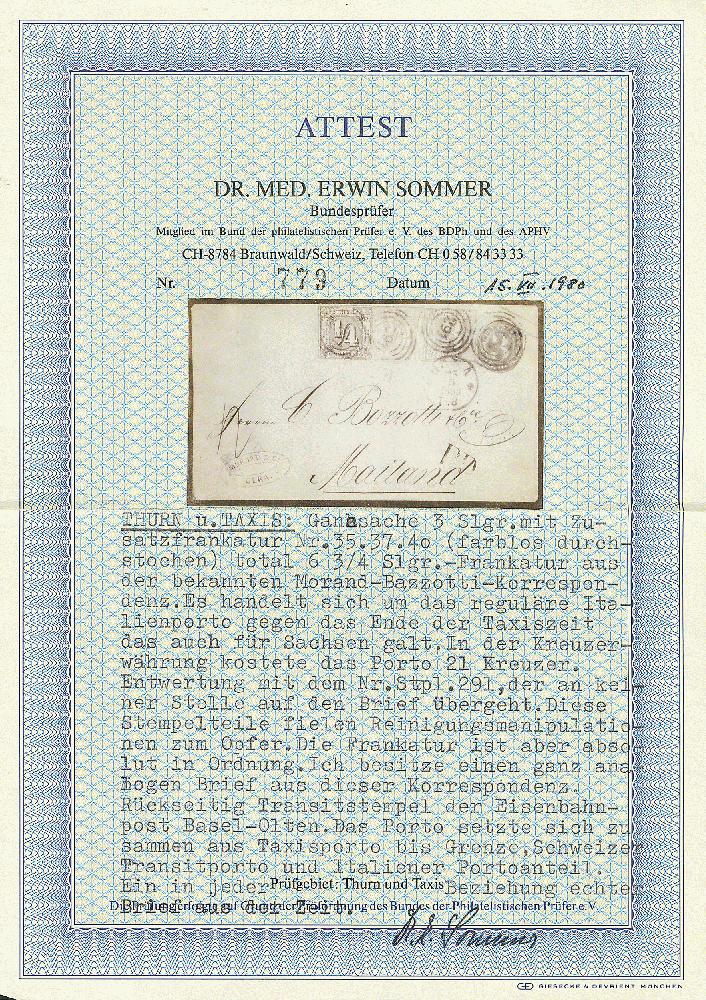 | Zusatzinformationen und Suchstichworte: | Dr. Derichs 170. Auktion 3. Juni 2023 Los 1462 Altdeutschland Thurn und Taxis 1/4 Sgr. schwarz, 1/2 Sgr. orange und 3 Sgr. ockerbraun, alle "farblos durchstochen", als Zusatzfrankatur auf Ganzsachenumschlag 3 Sgr. braun (Klappen teils geöffnet, einwandfrei) mit Nummernstempeln "291" und Aufgabe-K1 "Gera 25.5.1866" nach Mailand/Italien, nebengesetzt schwarzer "PD". Tarifrichtige 6 3/4-Silbergroschen-Rate für einen einfachen Brief durch die Schweiz nach Italien mit 3 Silbergroschen für den Postverein, 2 Silbergroschen für die Schweiz und 1 3/4 Silbergroschen für Italien. Eine möglicherweise einmalige Dreifarben-Zusatzfrankatur auf Ganzsachenumschlag. Luxus. Fotoattest Grobe, Fotoattest Dr. Sommer BPP und neues Fotoattest Sem BPP: "Alle Marken und der Umschlag sind einwandfrei erhalten... Seltene Frankatur-Kombination nach Mailand." Zuschlag 1.100,00 EUR |