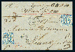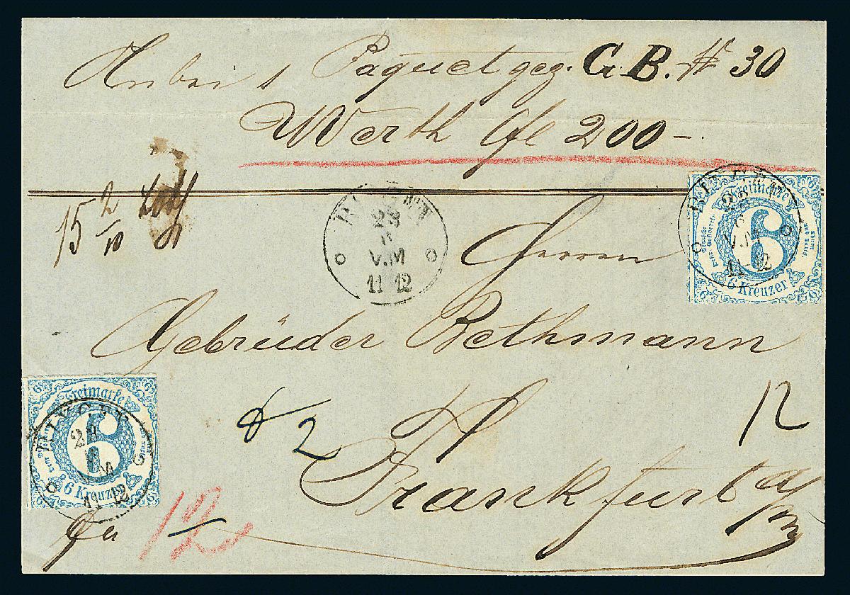 | Zusatzinformationen und Suchstichworte: | Dr. Derichs 170. Auktion 3. Juni 2023 Los 1492 Altdeutschland Thurn und Taxis 6 Kr. blau "farblos durchstochen", zwei Exemplare, einmal in Type "IA" und einmal in Type "IB", auf Wertpaketbegleitbrief für ein mit 20 Gulden deklariertes Paket mit K1 "Bingen 23/6" (1867) auf den Marken und nochmals beigesetzt an das Bankhaus der Gebrüder Bethmann in Frankfurt. Luxus. Tarifrichtige 12-Kreuzer-Frankatur für ein Wertpaket zur Mindesttaxe einschließlich Versicherungsgebühr, 2 Kreuzer Fahrpost-Bestellgeld zahlte der Empfänger. Sind mit Marken frankierte Paketbegleitbriefe schon selten, da sie erst ab 1.11.1866 zugelassen waren, so gilt dies für Wertpaketbegleitbriefe noch in deutlich höherem Maß. Neues Fotoattest Sem BPP: "einwandfrei erhalten". Zuschlag 950,00 EUR |