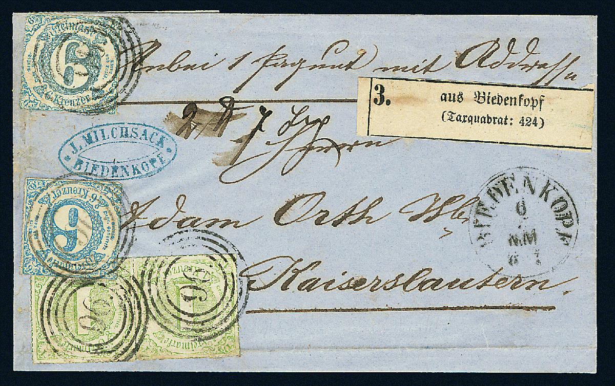 | Zusatzinformationen und Suchstichworte: | Dr. Derichs 170. Auktion 3. Juni 2023 Los 1500 Altdeutschland Thurn und Taxis 6 Kr. blau "farblos durchstochen", zwei Exemplare (einmal Type "IA" und einmal Type "IB"), in Mischfrankatur mit waagerechtem Paar 1 Kr. grün "farbig durchstochen" (rechte Marke unauffällige Randschäden) auf Paketbegleitbrief mit Nummernstempeln "96." und Aufgabe-K2 "Biedenkopf 6/5" (1867) nach Kaiserlautern/Bayerische Pfalz, mit schwarz/weißem Paketzettel "3. aus Biedenkopf (Taxquadrat: 424)". Tarifrichtige 14-Kreuzer-Mindesttaxe für einen Fahrpostbrief zwischen 16 und 20 Meilen Entfernung nach dem ab 1.1.1861 gültigen Vereinstarif. Neues Fotoattest Sem BPP: "Die Frankierung von Fahrpostsendungen mittels Freimarken war erst ab dem 1.11.1866 gestattet.". Zuschlag 420,00 EUR |