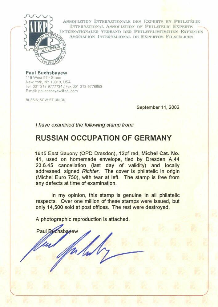 | Zusatzinformationen und Suchstichworte: | Corbitts 171. Briefmarken Auktion 4. Mai 2023 Los 468 SBZ Ostsachsen Sowjetzonen Ost Sachsen 1945 (23,6) lokalem Dresden Brief freigemacht 12 Pf., verwendet auf letzter Tag der Gültigheit, kleiner Einriss auf der linken Seite von Briefumschlag ansonsten fein, Paul Buchsbayew AIEP Attest 2002, Mi. 41. Zuschlag 170,00 GBP |