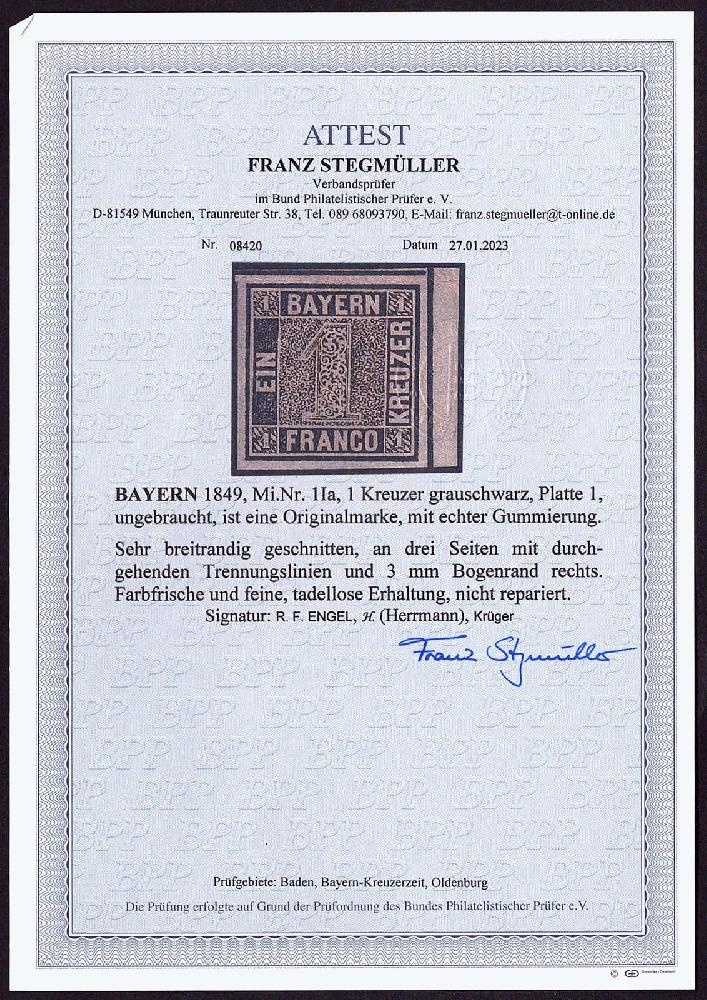 | Zusatzinformationen und Suchstichworte: | 74. Hadersbeck Auktion 18. - 20. April 2023 Los 1428 Altdeutschland Bayern 1 Kr. schwarzgrau, ungebraucht, mit Originalgummi, sehr breitrandig geschnitten, an 3 Seiten mit durchgehenden Trennungslinien und 3mm Bogenrand rechts, mehrfach signiert, Attest Stegmüller(01/23), KW 1300,- Zuschlag 960,00 EUR |