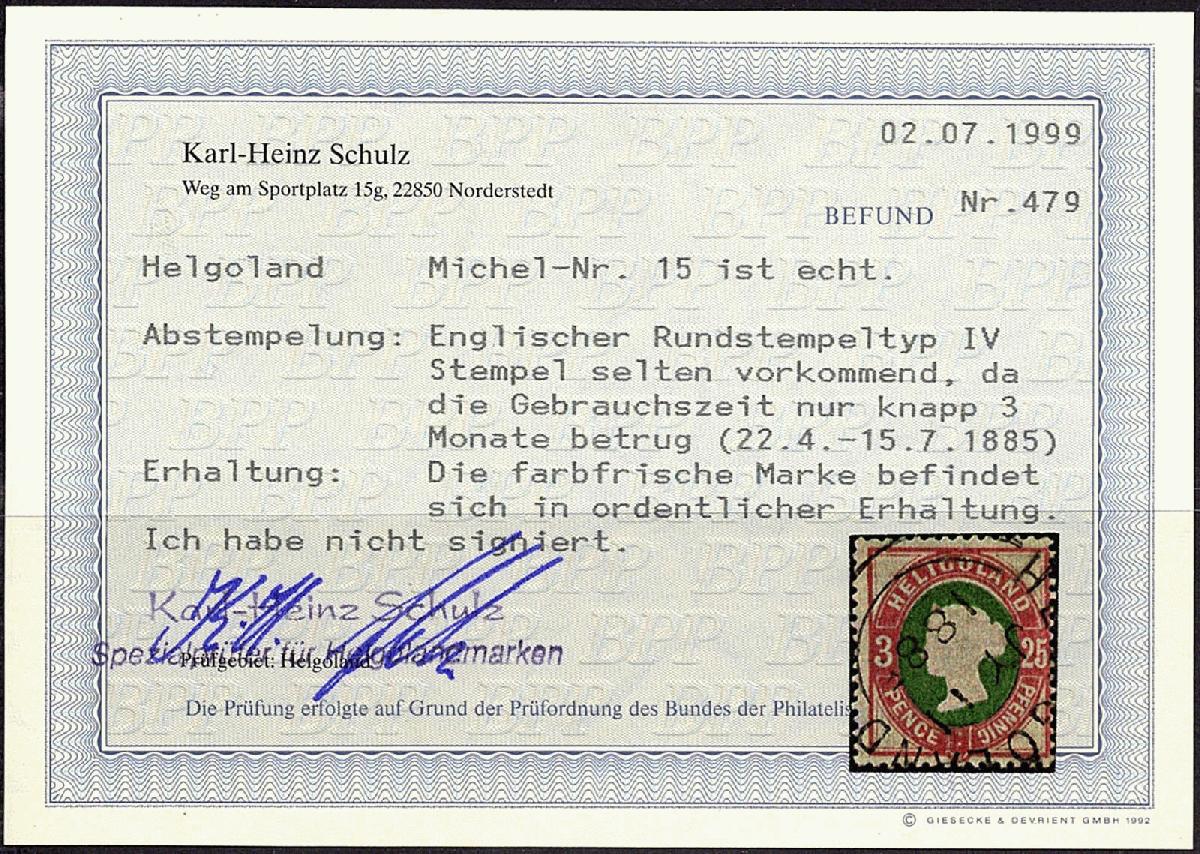 | Zusatzinformationen und Suchstichworte: | 74. Hadersbeck Auktion 18. - 20. April 2023 Los 1480 Altdeutschland Helgoland 3 P. 25 Pfg. lilakarmin/grün, englischer Rundstempel Type IV, selten vorkommend, die farbfrische Marke befindet sich in ordentlicher Erhaltung lt. Befund Schulz (07/99) Zuschlag 110,00 EUR |