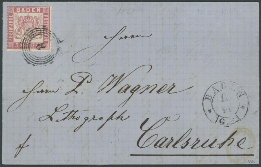| Zusatzinformationen und Suchstichworte: | nordphila 491. Briefmarkenfernauktion 5. Juni 2023 Los 11 Altdeutschland Baden 1862, 3 Kr. rosakarmin mit Nummernstempel "8" auf Prachtbrief von "BADEN" nach Carlsruhe, Fotoattest Englert Ausruf 190,00 EUR |