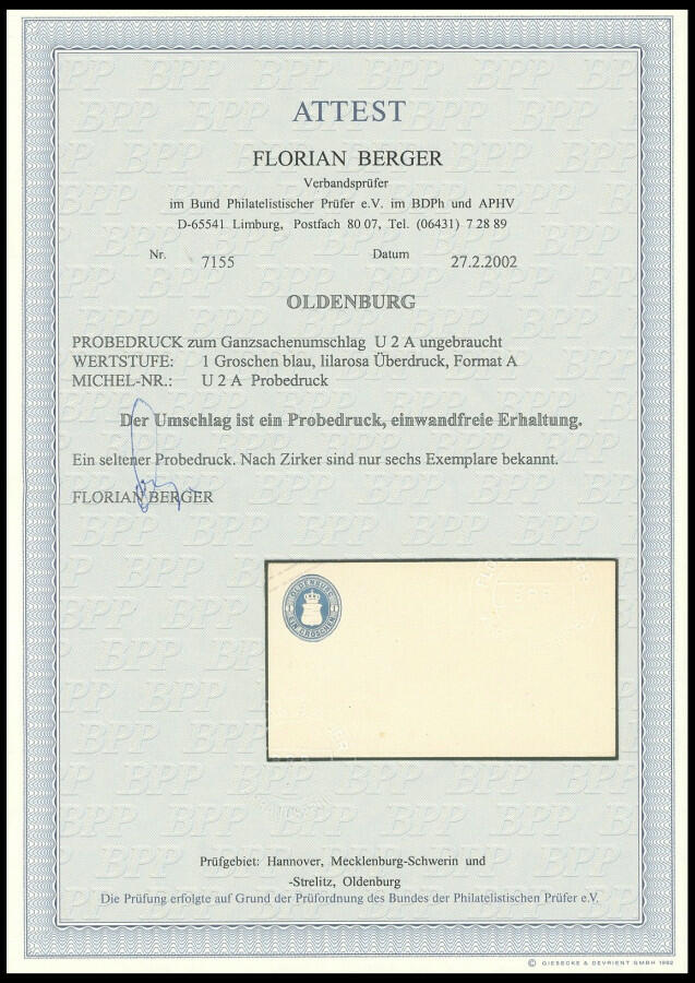 | Zusatzinformationen und Suchstichworte: | nordphila 491. Briefmarkenfernauktion 5. Juni 2023 Los 173 Altdeutschland Oldenburg Ganzsachen: Probedruck 1 Gr. preussischblau, Ganzsachen-Umschlag mit Überdruck in "LILAROSA" statt "PREUSSISCHBLAU", ungebrauchte Prachterhaltung. Laut Literatur wurden nur 6 Exemplare dieses Probedrucks hergestellt, wobei es sich hier um das möglicherweise einzig bekannte Exemplar handelt, Fotoatteste Berger und Stegmüller, RRR! Ausruf 3.500,00 EUR |