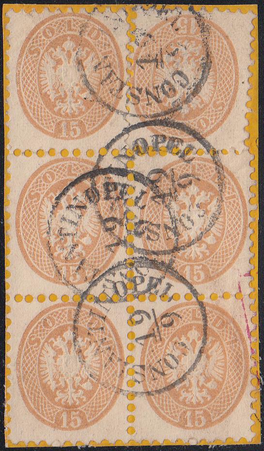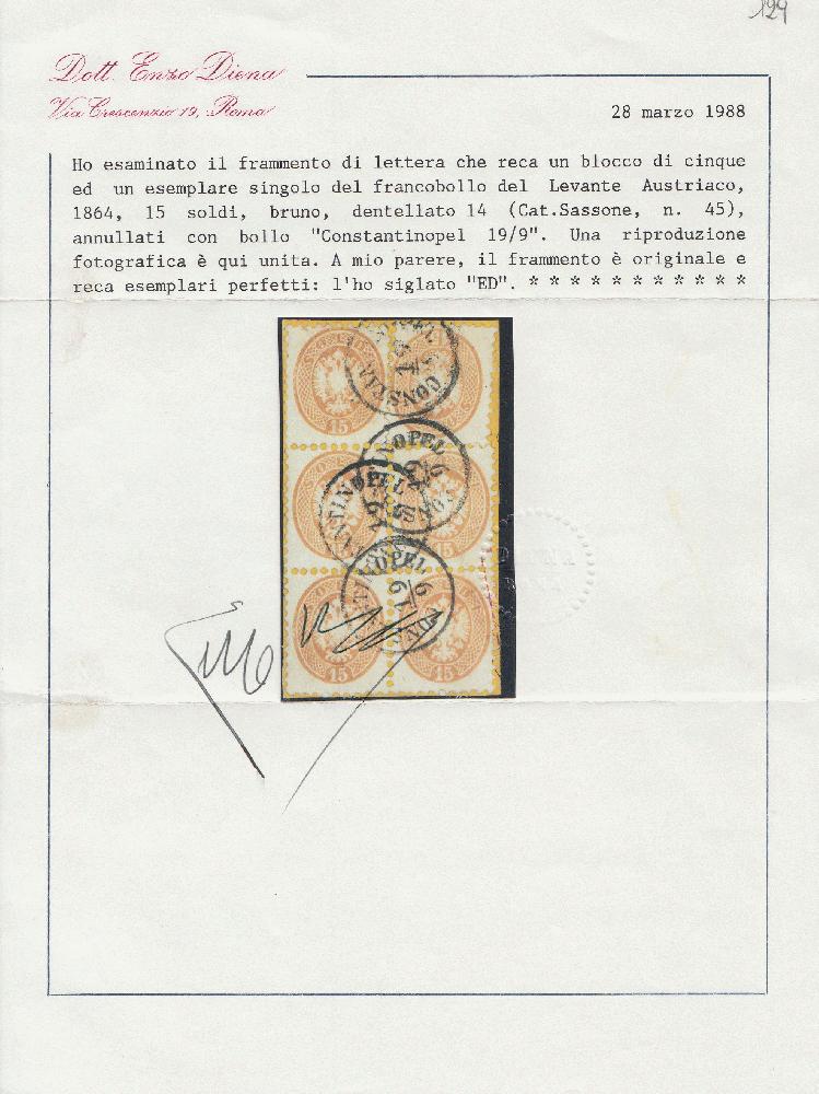 | Zusatzinformationen und Suchstichworte: | Fünferblock und Einzelmarke auf Briefstück. Signiert Enzo Diena, Alberto Diena, Sorani. Fehler im Attest: "dentellato 14" statt "dentellato 9 1/2" (Zähnung). Sassone Nummer 45 stimmt, "dentellato 14" wäre die teurere Sassone Nummer 40. |