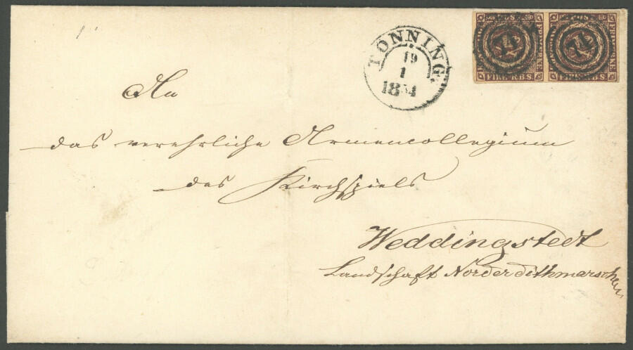 | Zusatzinformationen und Suchstichworte: | nordphila 491. Briefmarkenfernauktion 5. Juni 2023 Los 253 Altdeutschland Schleswig Holstein "74" (TÖNNING) auf waagerechtem Paar 4 RBS schwarzbraun, Platte I Nr. 85, auf Brief nach Weddingstedt, fast unsichtbare Archivfalte, Pracht Ausruf 180,00 EUR |