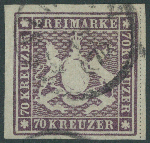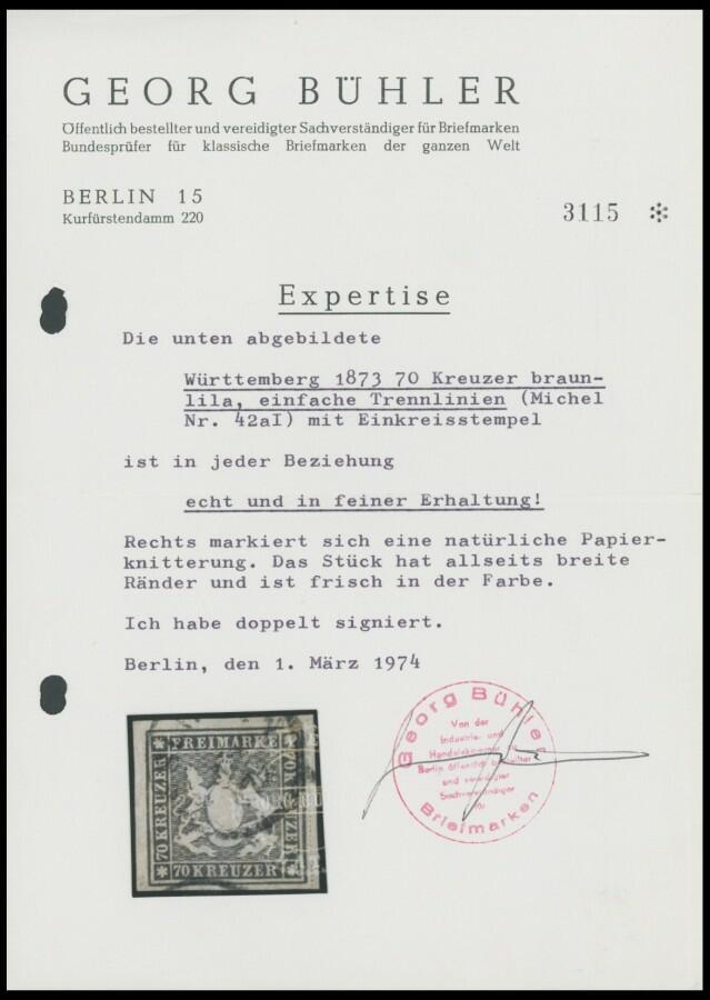 | Zusatzinformationen und Suchstichworte: | nordphila 491. Briefmarkenfernauktion 5. Juni 2023 Los 460 Altdeutschland Württemberg 1873, 70 Kr. braunlila, voll-breitrandig, rechts eine natürliche Papierknitterung, farbfrisches Prachtstück Ausruf 1.500,00 EUR |