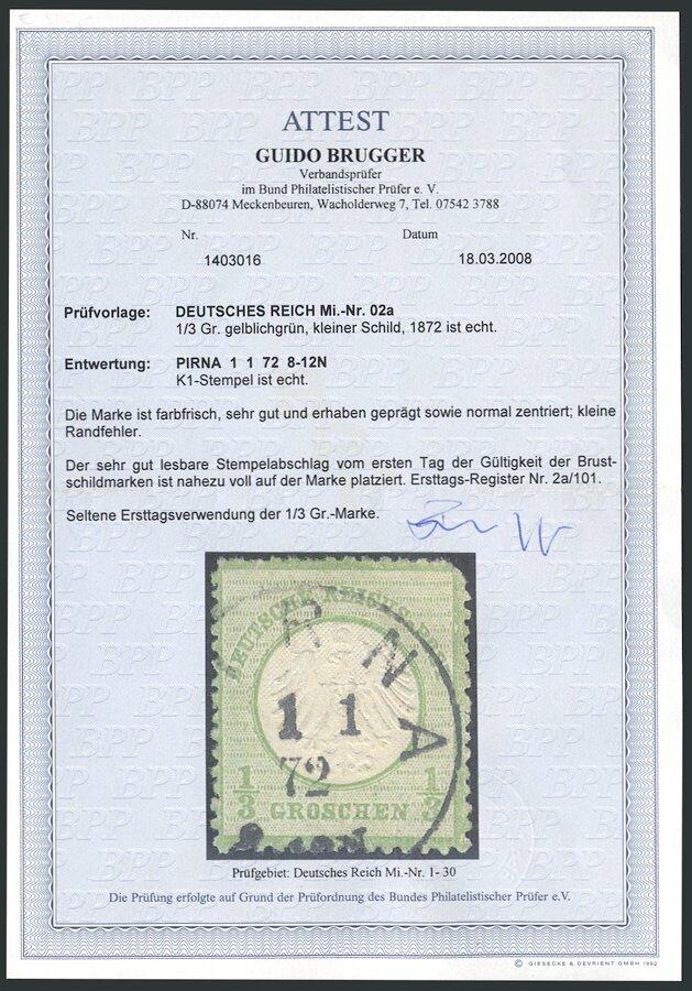 | Zusatzinformationen und Suchstichworte: | nordphila 491. Briefmarkenfernauktion 5. Juni 2023 Los 598 Deutsches Reich, 1872 Kleiner Brustschild 1872, 1/3 Gr. gelblichgrün mit Ersttagsstempel "PIRNA 1.1.72", kleiner Randfehler sonst Pracht Ausruf 280,00 EUR |