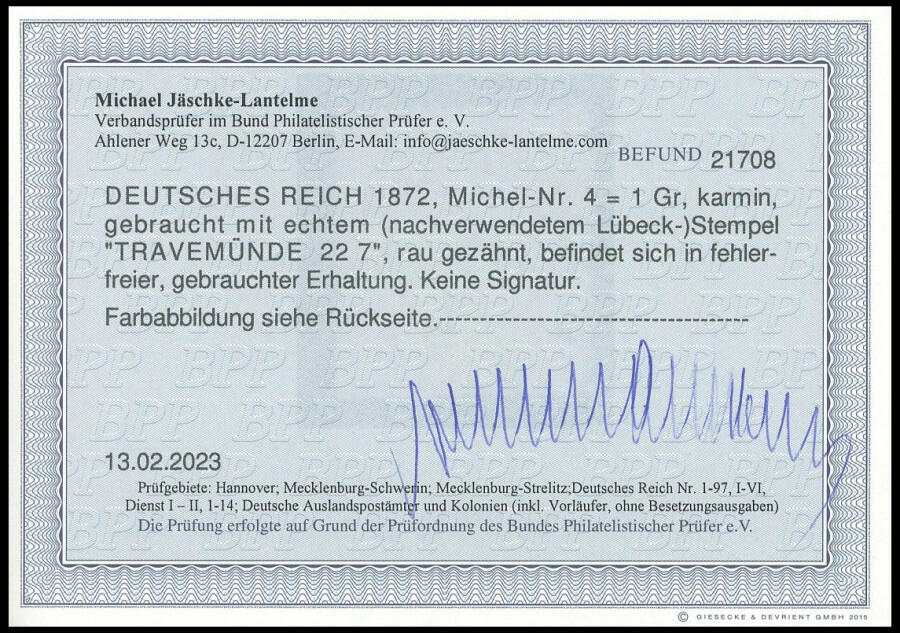 | Prüfer: | Jäschke-Lantelme, Michael (BPP (Bund Philatelistischer Prüfer)) |