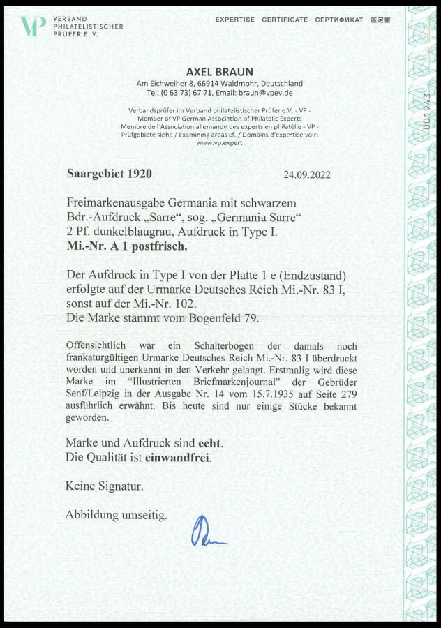 | Prüfer: | Braun, Axel (VP (Verband Philatelistischer Prüfer)) |