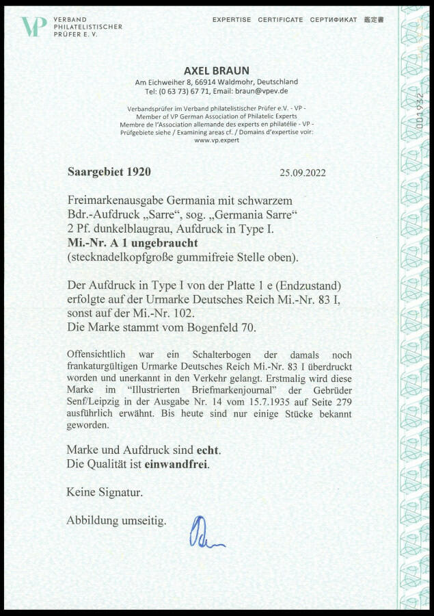 | Prüfgebiet: | Saargebiet (Mi-Nr. 1 - 205) |