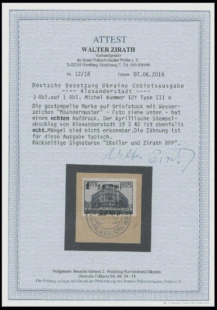 | Zusatzinformationen und Suchstichworte: | nordphila 491. Briefmarkenfernauktion 5. Juni 2023 Los 2290 Deutsche Besetzung II. WK Ukraine 1942, 3 Rbl. auf 1 Rbl. dunkelblau, Wz. Mäandermuster, Prachtbriefstück Ausruf 750,00 EUR |
