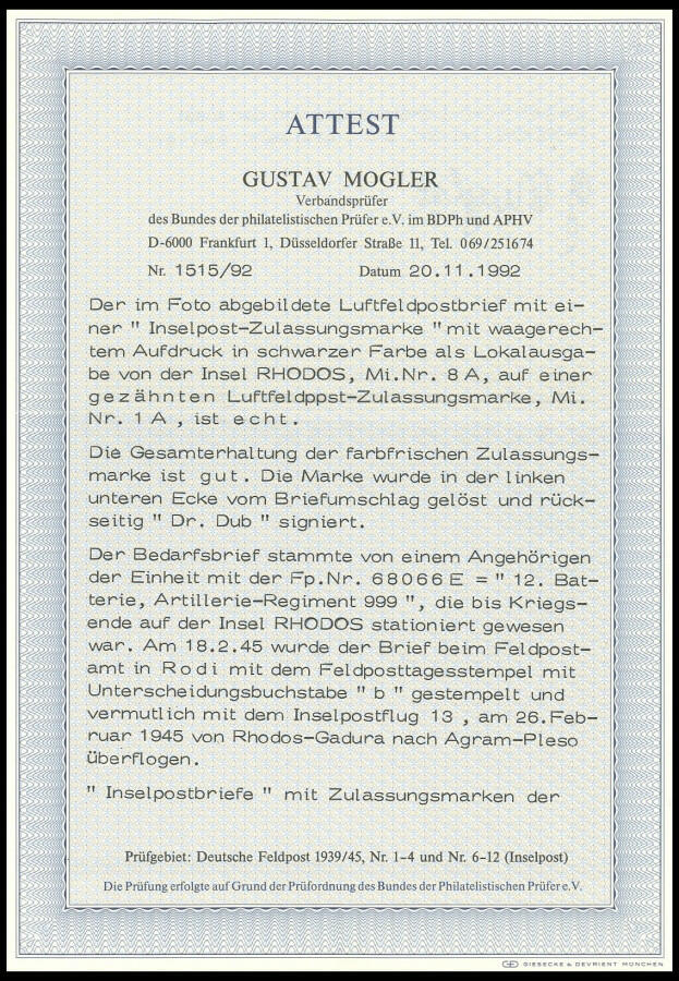 | Zusatzinformationen und Suchstichworte: | nordphila 491. Briefmarkenfernauktion 5. Juni 2023 Los 2300 Deutsche Besetzung II. WK, Feldpostmarken 1945, "Insel Rhodos", gezähnt, auf Bedarfsbrief mit der FP-Nr. "68066E" nach Pforzheim, Pracht Ausruf 2.800,00 EUR |