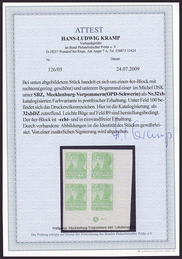 | Zusatzinformationen und Suchstichworte: | nordphila 491. Briefmarkenfernauktion 5. Juni 2023 Los 2526 SBZ Mecklenburg Vorpommern 1946, 5 Pf. mittelgrün, Kreidepapier, im Eckrandviererblock mit Druckereizeichen, postfrisch, Pracht Ausruf 490,00 EUR |