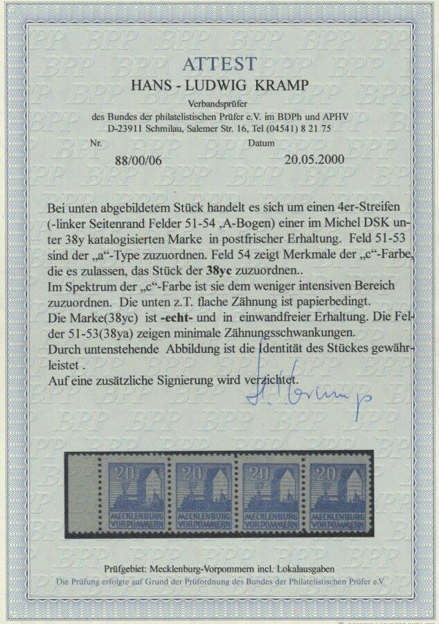 | Zusatzinformationen und Suchstichworte: | nordphila 491. Briefmarkenfernauktion 5. Juni 2023 Los 2572 SBZ Mecklenburg Vorpommern 1946, 20 Pf. schwärzlichgrauultramarin (Feld 54) im Viererstreifen mit 3x Mi.Nr. 38ya, postfrisch, Pracht Ausruf 160,00 EUR |