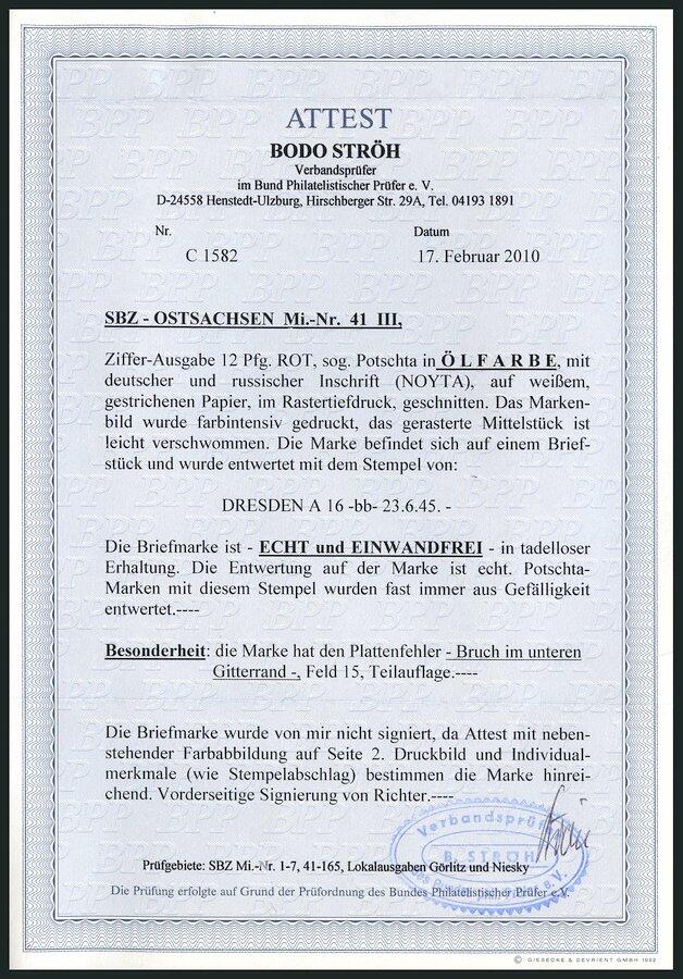 | Zusatzinformationen und Suchstichworte: | nordphila 491. Briefmarkenfernauktion 5. Juni 2023 Los 2584 SBZ Ostsachsen 1945, 12 Pf. rot "POTSCHTA" mit Abart "Bruch im unteren Gitterrand", Prachtbriefstück, RR! Ausruf 800,00 EUR |