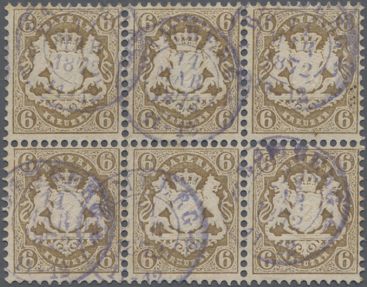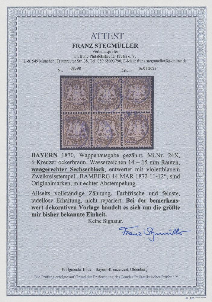 | Zusatzinformationen und Suchstichworte: | Christoph Gärtner 7. Sonderauktion IBRA Essen 26. Mai 2023 Los 17 D Altdeutschland Bayern 1870 'Wappen' 6 Kr. ockerbraun, Wz. "ENGE Rauten", waag. SECHSERBLOCK, sauber entwertet mit violettblauem Zweikreisstempel "BAMBERG 14 MAR 1872 11-12", farbfrisch und in tadelloser, sehr guter Erhaltung. "... die größte mir bisher bekannte Einheit" (Zitat aus dem Attest F. Stegmüller BPP, 2023) Zuschlag 6.200,00 EUR |