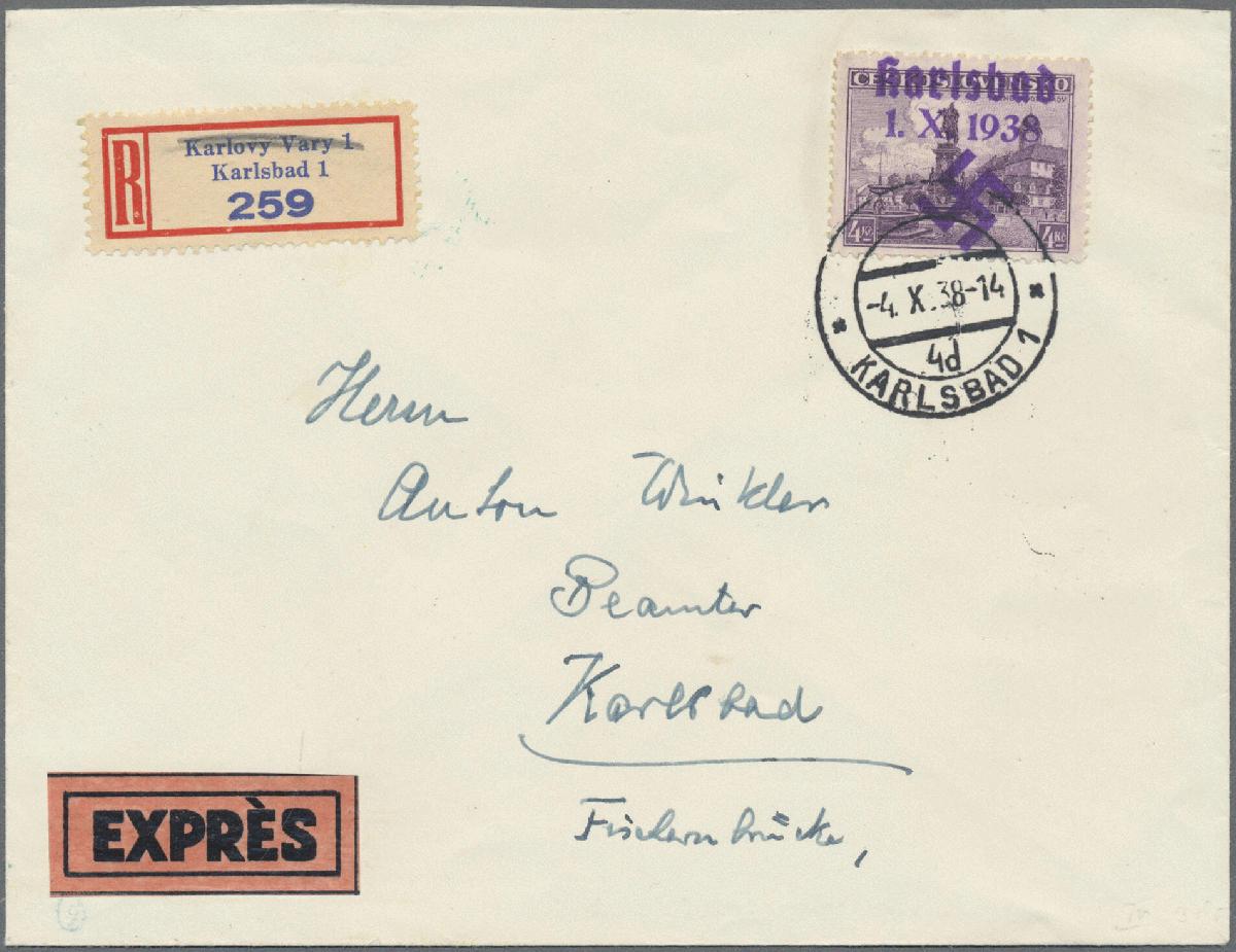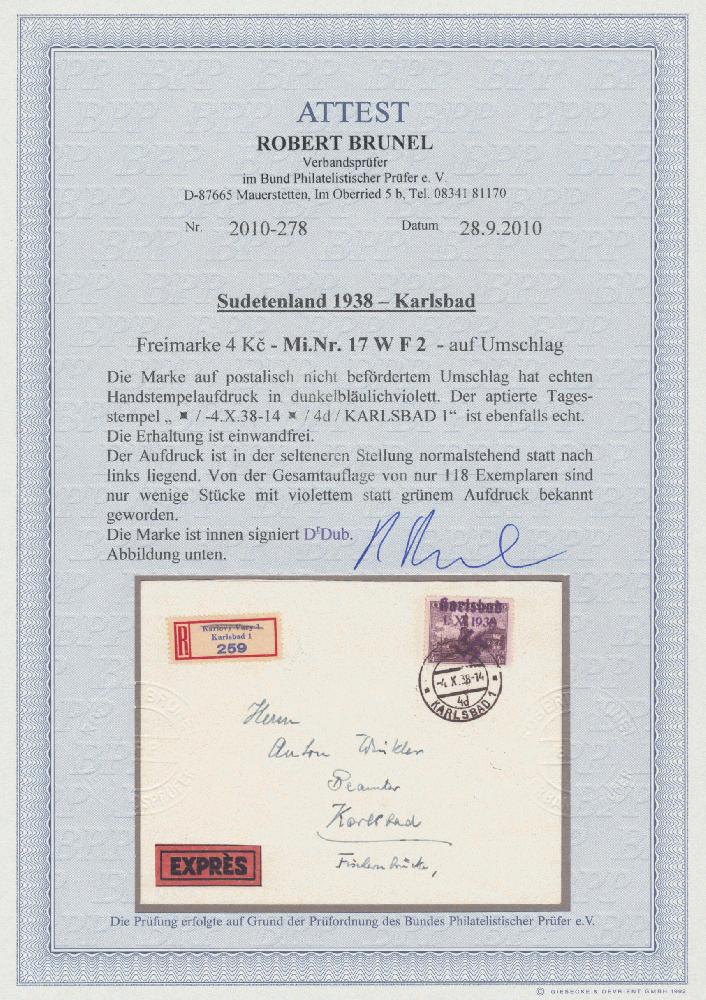 | Zusatzinformationen und Suchstichworte: | Christoph Gärtner 7. Sonderauktion IBRA Essen 26. Mai 2023 Los 29 D Sudetenland Karlsbad 1938, Freimarke 4 Kc "Landschaften" mit äußerst seltenem waagerechtem Handstempelaufdruck in dunkelbläulichviolett auf postalisch nicht gelaufenem Umschlag, entwertet mit aptiertem Tagesstempel "-4.X.38-14 * * 4 d KARLSBAD 1". Von der Gesamtauflage von nur 118 Stück sind nur wenige Stücke mit violettem statt grünem Aufdruck bekannt geworden Zuschlag 2.000,00 EUR |