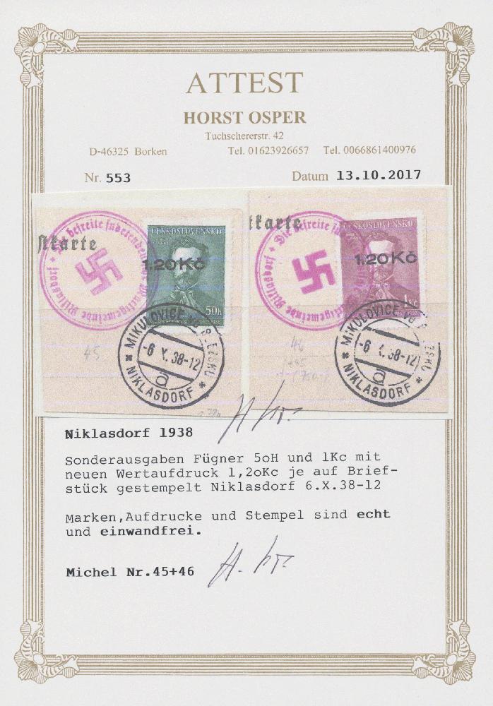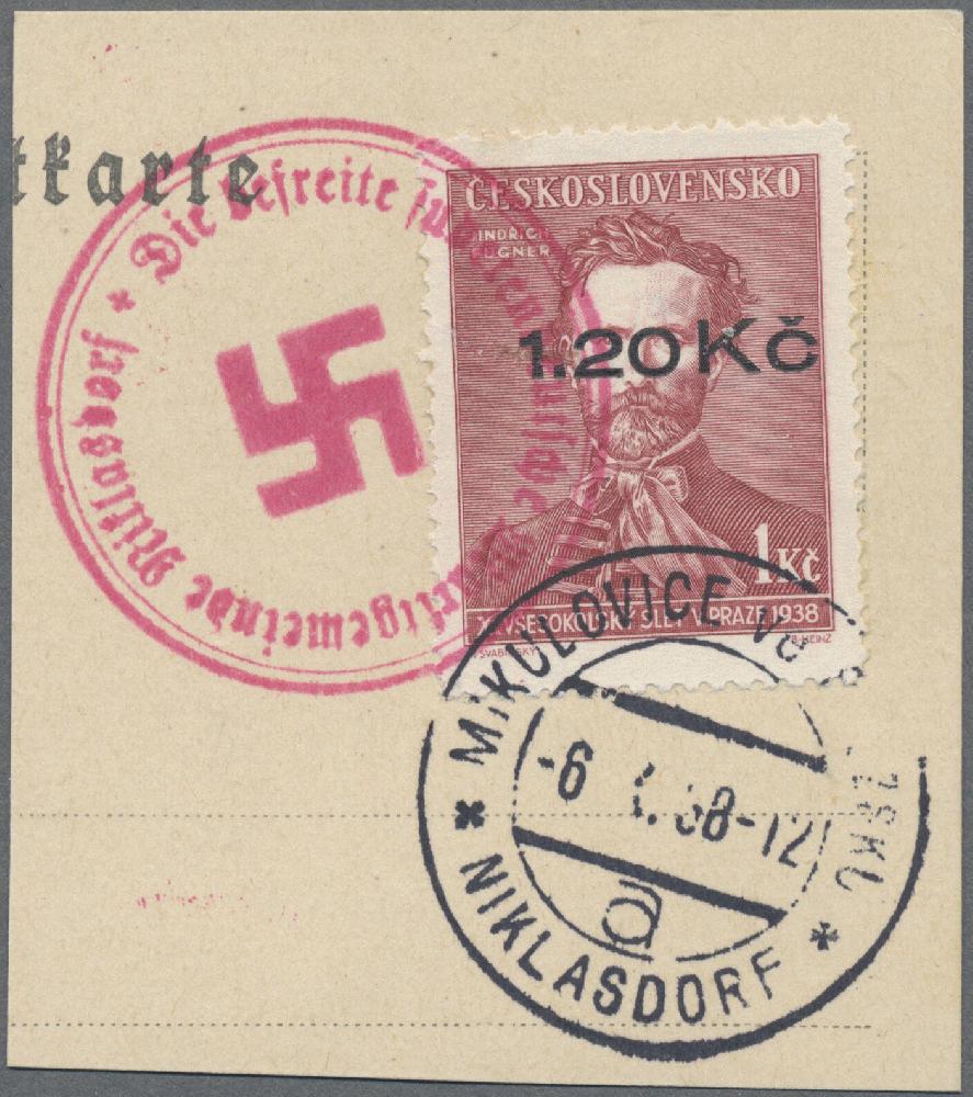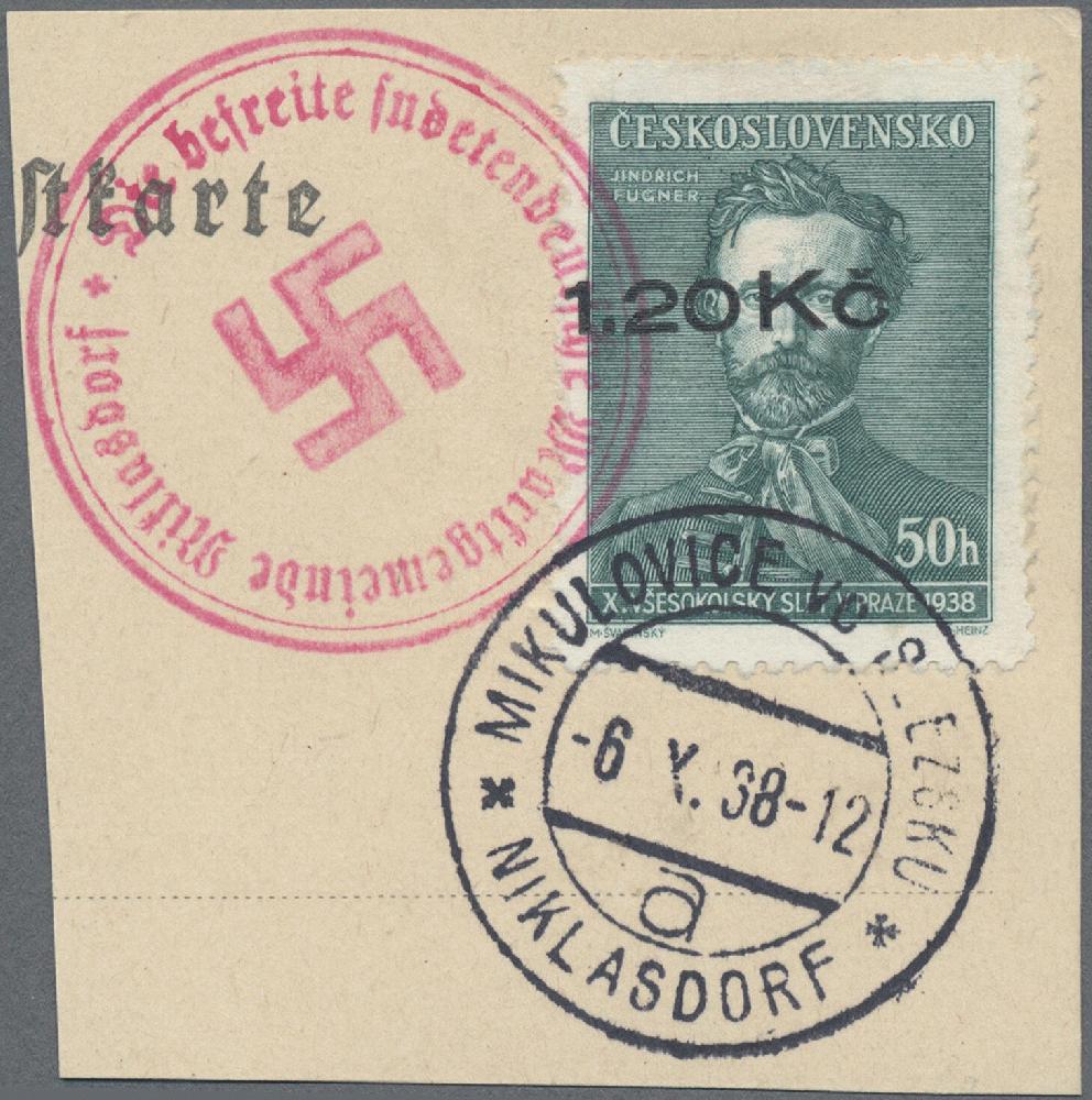 | Zusatzinformationen und Suchstichworte: | Christoph Gärtner 7. Sonderauktion IBRA Essen 26. Mai 2023 Los 39 D Sudetenland Niklasdorf 1938, Fügner 1.20 Kc auf 50 H schwärzlichblaugrün und 1.20 Kc auf 1 Kc kaminrot je auf tadellosem Briefstück, sauber entwertet am -6.X.38 sowie mit rotem Befreiungsstempel, signiert und mit Foto-Attest Osper (2017): "echt und einwandfrei". Insgesamt wurden nur nur 40 bzw. 75 Stück überdruckt, daher ein sehr seltenes Duo! Zuschlag 1.800,00 EUR |