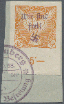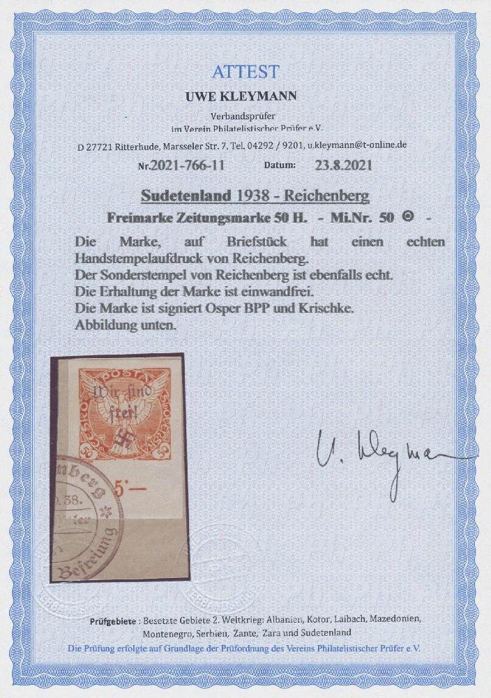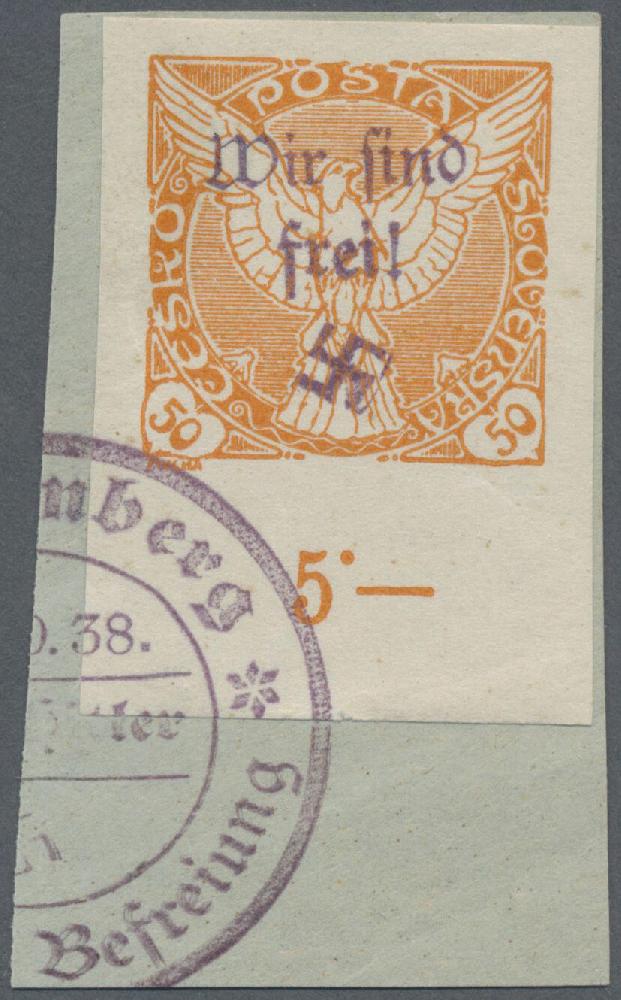 | Zusatzinformationen und Suchstichworte: | Christoph Gärtner 7. Sonderauktion IBRA Essen 26. Mai 2023 Los 43 D Sudetenland Reichenberg Maffersdorf 1938, Zeitungsmarke 50 H orange vom Unterrand mit Handstempelaufdruck auf dekorativem Briefstück, entwertet mit Befreiungsstempel von Reichenberg. Signiert Osper BPP und Krischke sowie mit Foto-Attest Kleymann VP (2021): "echt und einwandfrei". Mit einer Auflage von nur 10 Stück eine der ganz großen Raritäten aus dem Sudetenland, die nur sehr selten einmal angeboten werden! Ausruf 2.000,00 EUR |