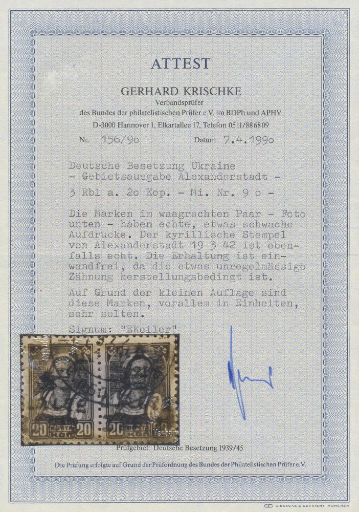 | Zusatzinformationen und Suchstichworte: | Christoph Gärtner 7. Sonderauktion IBRA Essen 26. Mai 2023 Los 48 D Deutsche Besetzung II. WK Ukraine Alexanderstadt 1942, 3 Rbl. auf 20 Kop. grün, Luxuspaar, herstellungsbedingt gezähnt und zentriert. Altes Fotoattest Krischke BPP "Die Marken im waagerechten Paar haben echten, etwas schwachen Aufdruck. Der kyrillische Stempel von Alexanderstadt 19 3 42 ist ebenfalls echt. Die Erhaltung ist einwandfrei da die etwas unregelmäßige Zähnung herstellungsbedingt ist. Aufgrund der kleinen Auflage sind diese Marken, vor allem in Einheiten, sehr selten." Mi€3.600,- ++. Zuschlag 1.000,00 EUR |